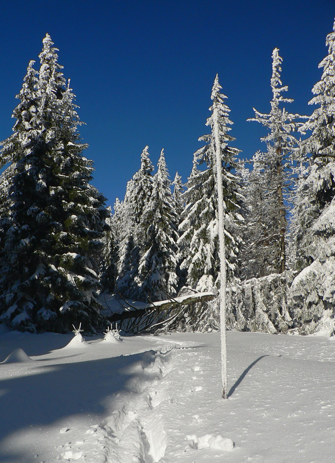 Jednoduchá prechádzka, tak na šesť hodín: z Vrútok hore na Minčol od kempingu po žltej a dole po susednom bočnom hrebeni, po modrej. Bežne nič moc, po zvážniciach, výsekoch a rúbaniskách, len vršok okolo hrebeňa je krajší. Ale v modrobielom počasí paráda. A občas aj prešľapávanie vajcového snehu, aj keď našťastie stopa už bola. Ale tí prví sa museli nadrieť...