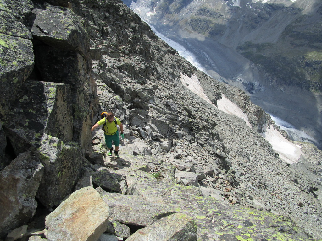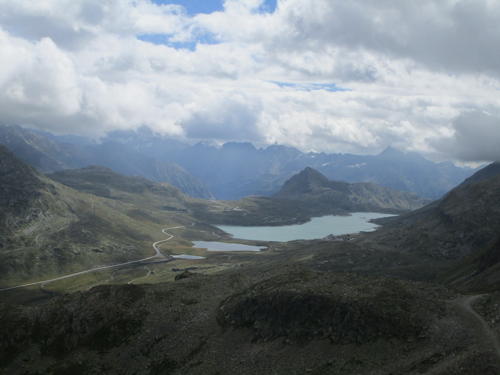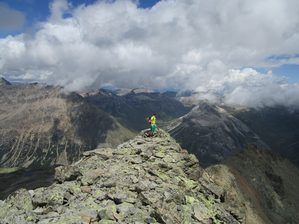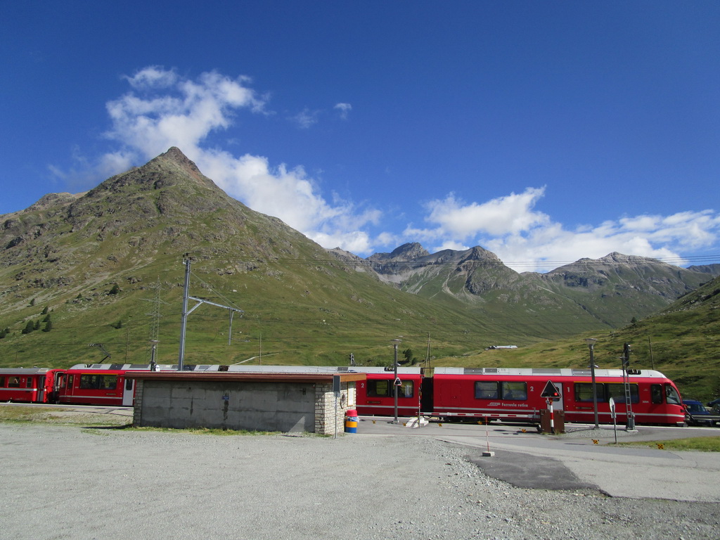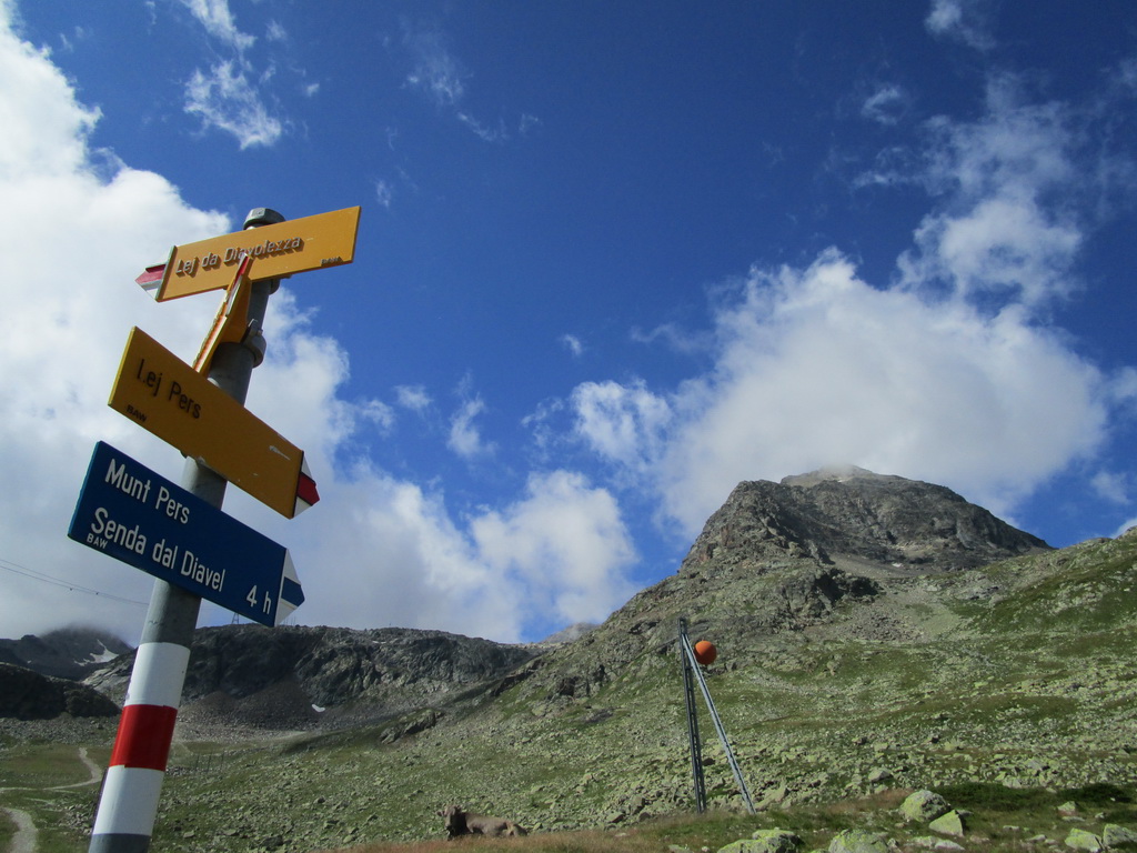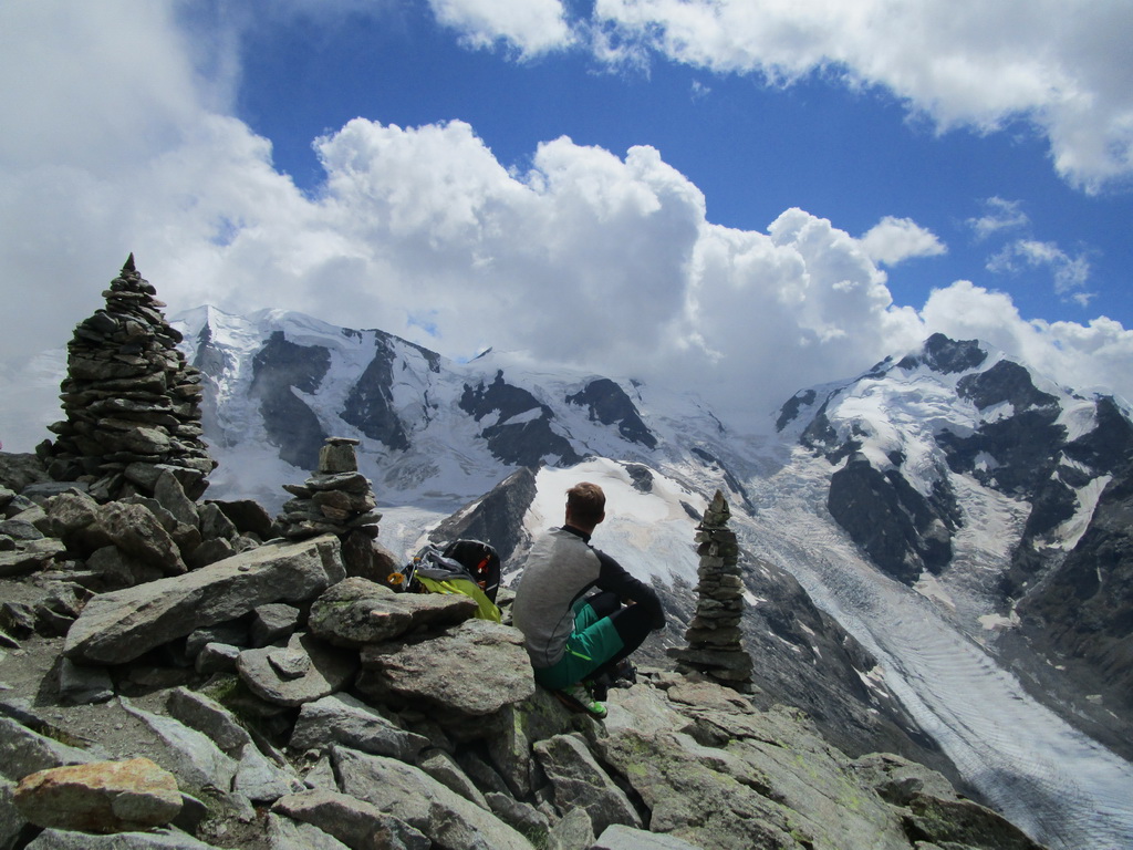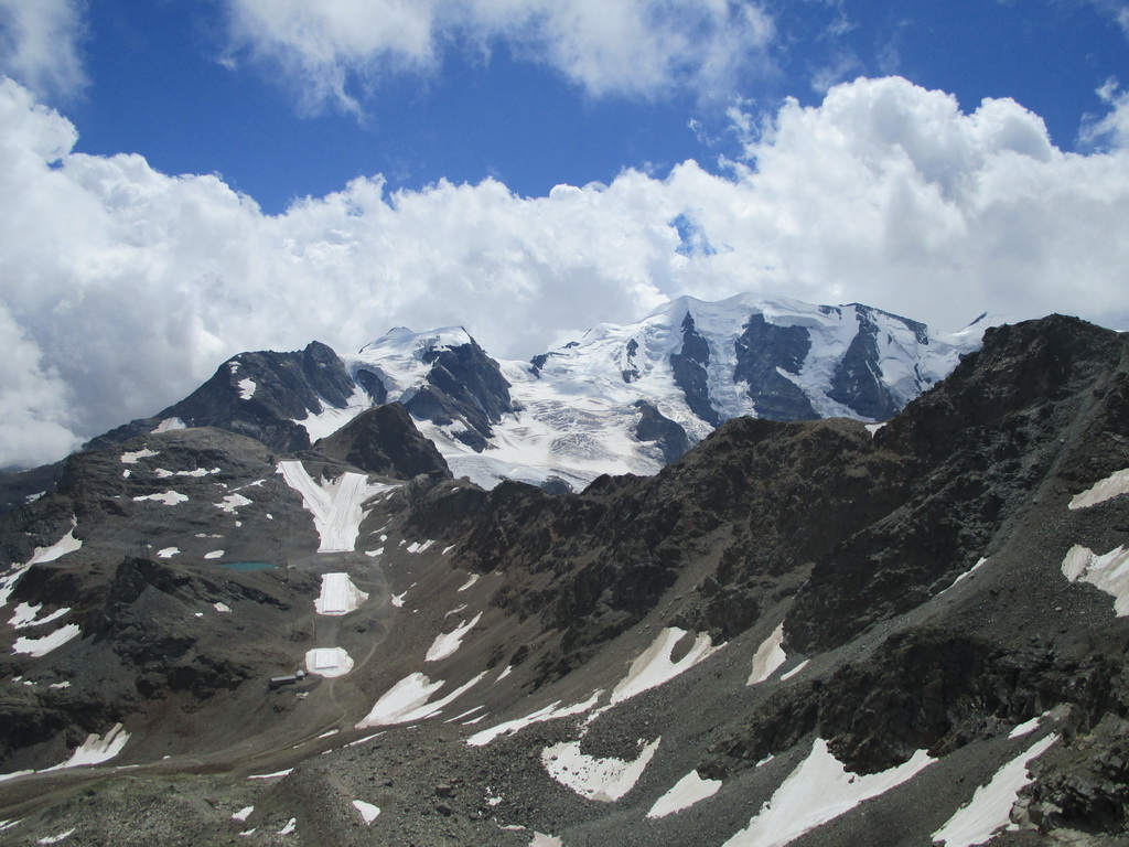 Na začiatku túry neisté počasie nás na vrchole odmeňuje úžasnými výhľadmi na Palú, Berninu a spol... Zostupujeme jednoduchým chodníčkom ku vrchnej stanici Diavolezzy. Tu správcovia zaistenej trasy rátali s tým, že civilizovaní občania niečo skonzumujú, kúpia si lístok dole a šetriac kolená sa zvezú lanovkou.