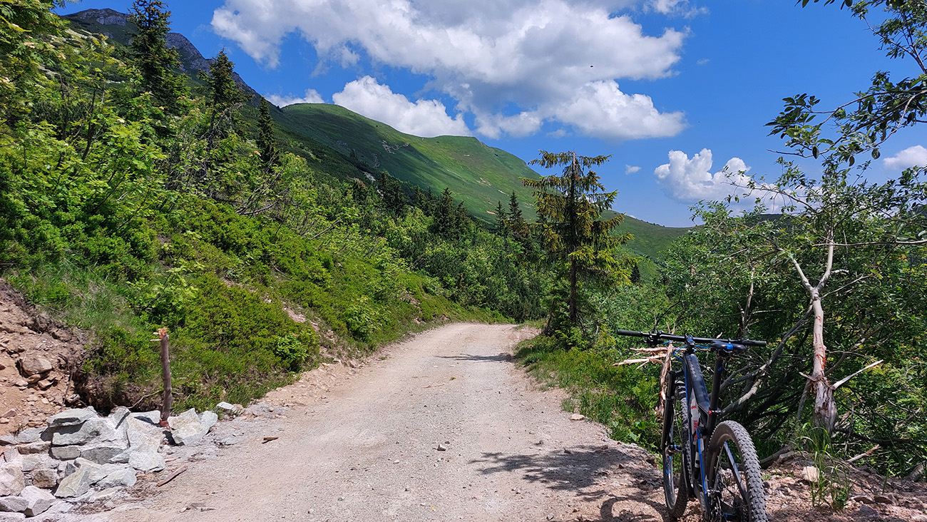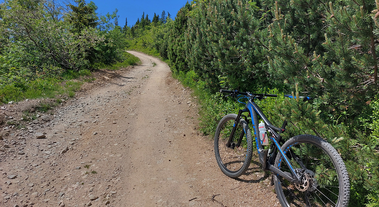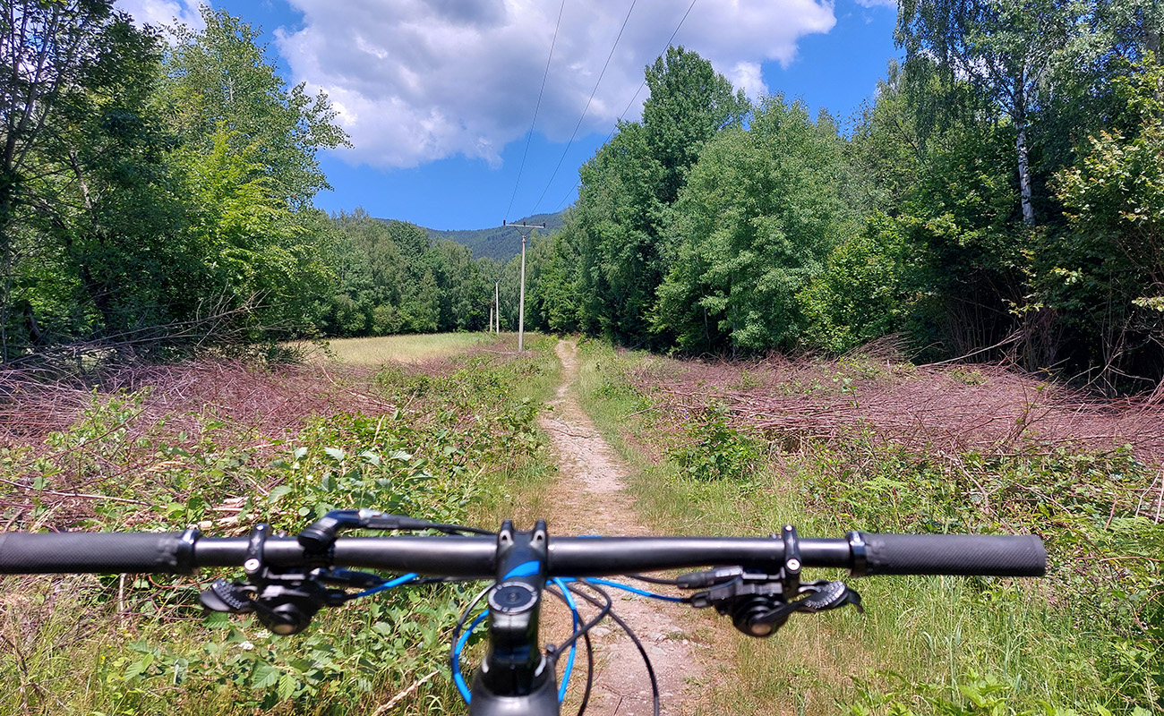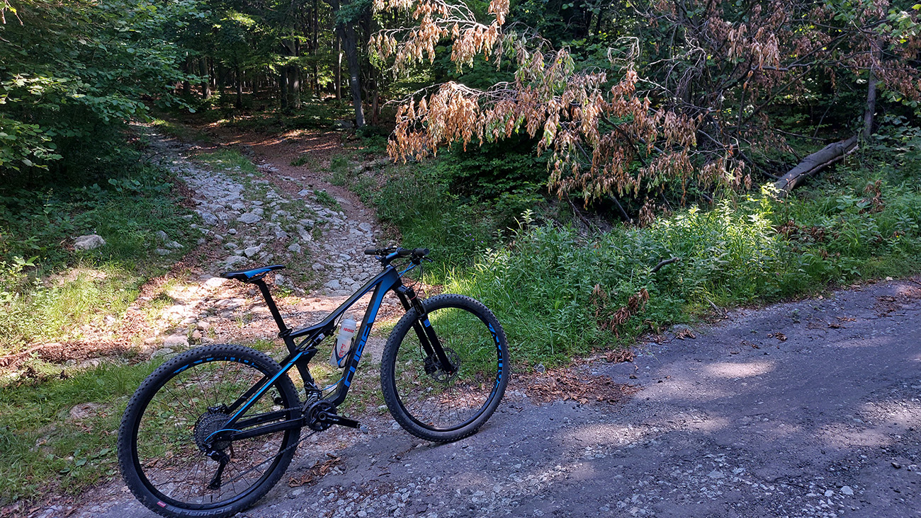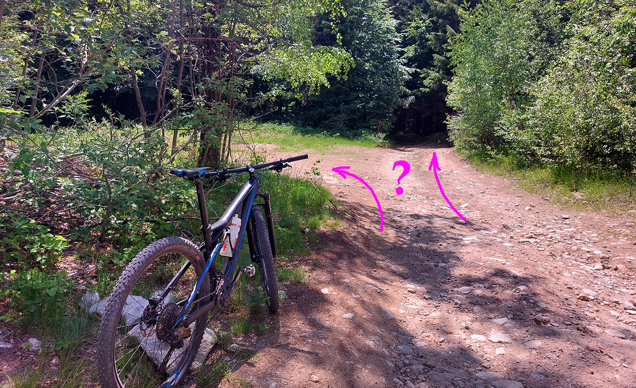 Míňame prívetivo sa tváriacu odbočku doľava – je to tá akože skratka, ktorou sa dá dostať k zelenej značke na drevosklade, ale neodporúčam ani z tohto smeru. Je na nej dosť hnusných, zle jazditeľných úsekov – strmo stúpajú a sú plné voľných šutrov a šišiek, zadné kolo na nich nepríjemne odskakuje. Len jej úvod sa tvári takto nevinne: