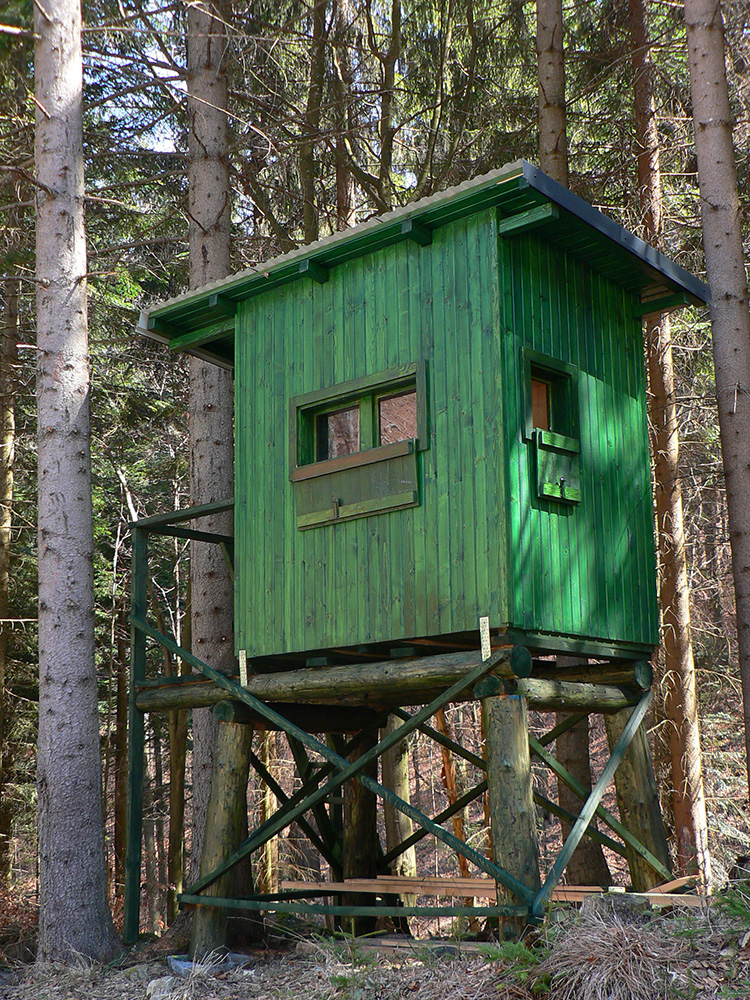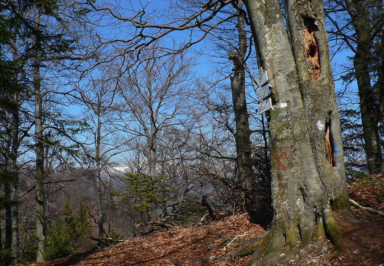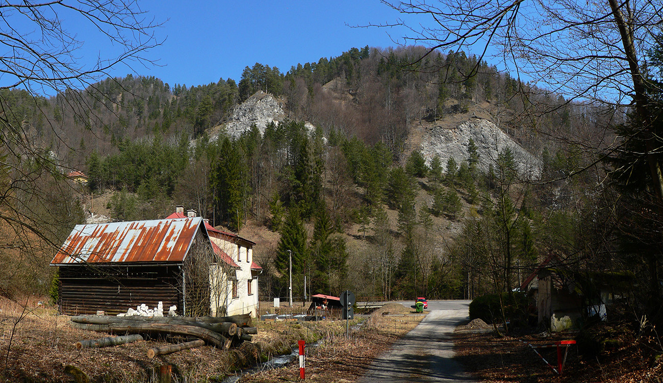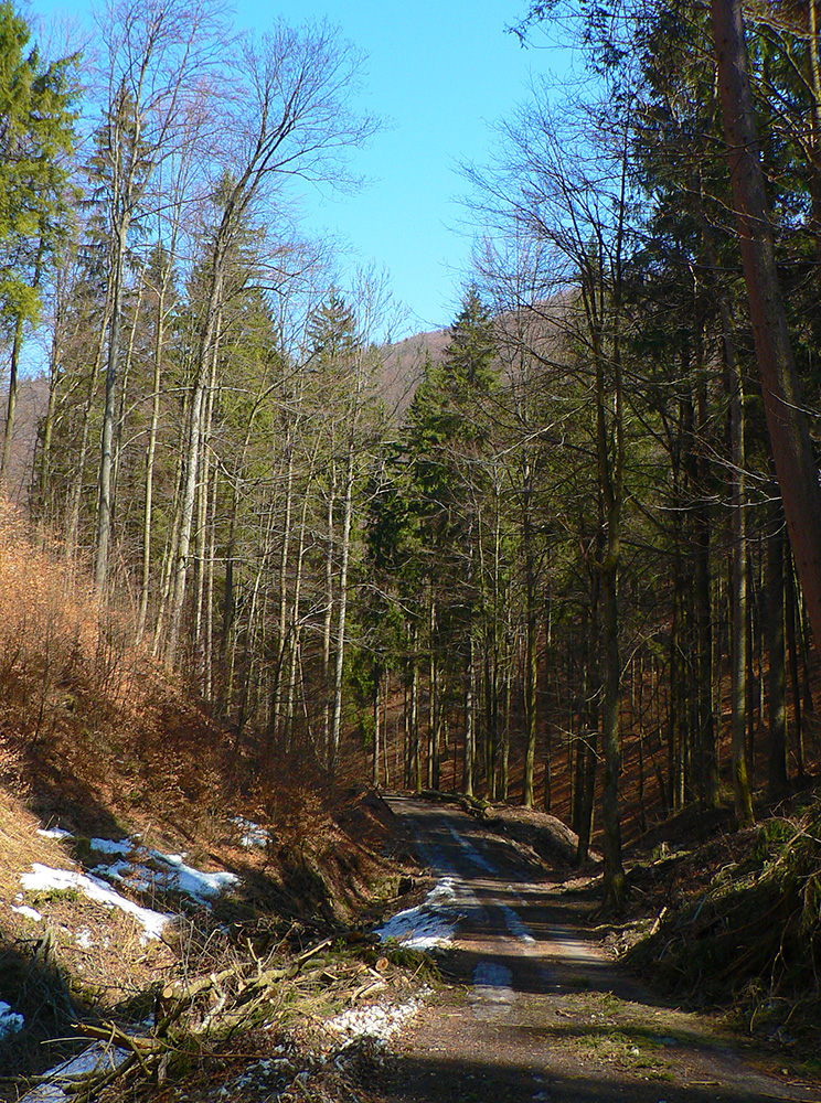 Pár serpentín, z jednej je krátka odbočka doprava k novej chatke v oplotenom areáli. Podľa insitnej (alebo infantilnej?) umeleckej výzdoby asi tiež jágri. Chatka je ale pre orientáciu dôležitá. Priamo nad ňou, za poslednou serpentínou, asfaltka totiž pokračuje už priamo na severozápad popod hrebeň, lenže treba ísť doľava, po výraznej, spevnenej lesnej ceste, ktorá asi po 500 m (za prvou zákrutou) križuje modrú značku.