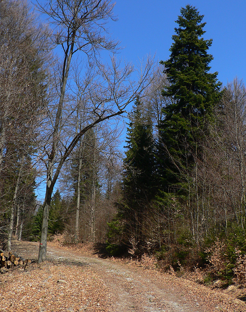 Štefanka je ešte pár metrov ďalej, ale tam netreba ísť, je to len križovatka zvážnic (aj keď geomorfologicky je to zaujímavosť - tu sa stretajú Starohorské vrchy, Kremnické vrchy a Veľká Fatra). Treba zabočiť z cesty doľava na modrú, ako ukazuje fotka tu vyššie. Cez Vápenicu, Kozeľník na Kotolnicu je to potom pekný, hrboľatý, bralnatý hrebienok, taký hore - dole. Výhľady síce minimálne, ale les pekný, divoký, okrem úvodnej zvážnice. Sem – tam presvitne vpravo dole Dolný Harmanec, vľavo vpredu Krížna. Až na konci, na Kotolnici, je malá lúčka s lavičkou a parádnym výhľadom.