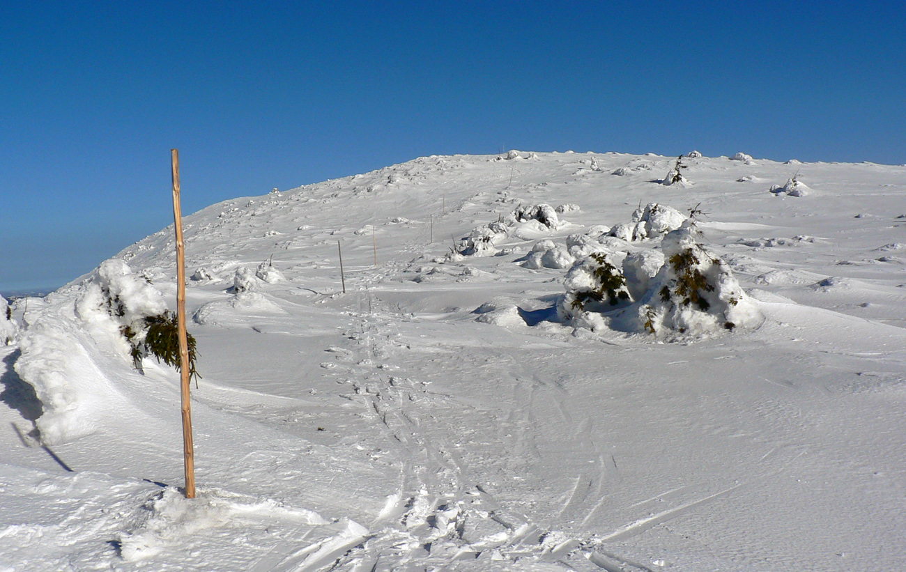 Kde to bolo pod lyžami ešte tuhé, samozrejme, že to bolo poriadne hrboľaté, vyfúkané do tvaru šindľov, žraločích zubov a podobných pásožravých patvarov. Ale chodníček vždy vydupaný pomedzi to. Pešiakmi a snežničiarmi. Ale v podstate väčšina hrebeňa je priechodná aj bez snežníc.