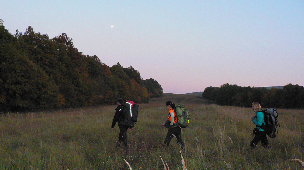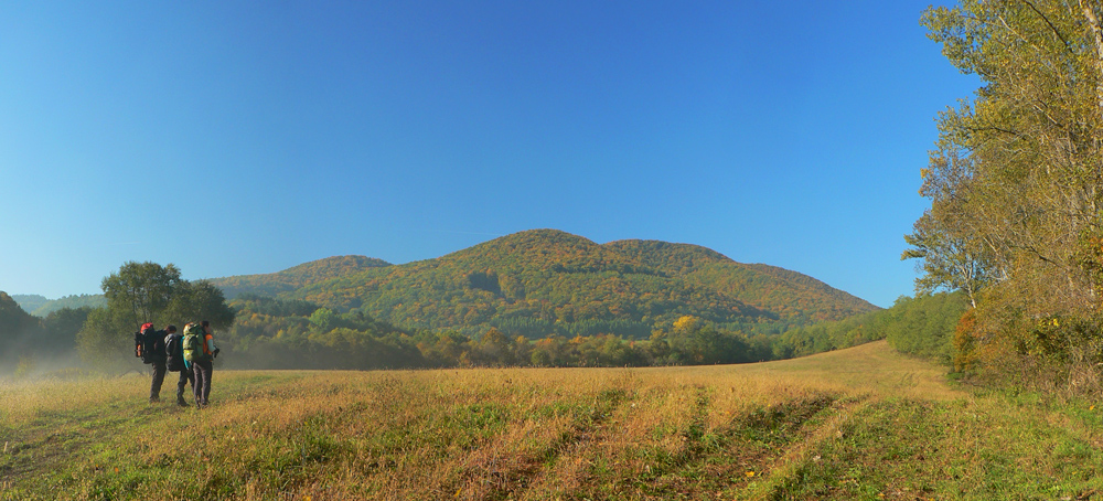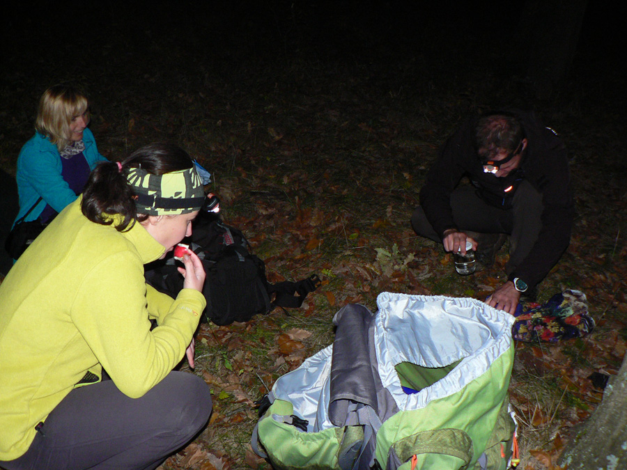 Poriadnym lesom je to až krížom cez Pohanský hrad - rezervácia na rozľahlej „stolovej hore“ ozaj vyzerá ako divočina. Až sa zase značka stráca. A zas behajú bludičky po hore: Máš? Nemám! Aha tu je! Tadeto! A to je kade? Nevidím ťa! No a čo, stačí že počuješ... Ale to bol už posledný zážitok dňa, lebo o chvíľu sú tu vrcholové lúky a o ďalšiu chvíľu už kempujeme pod dubom (ktovie či cerovým), ktorý nás do rána ochráni pred rosou. A bude to dlhá noc, lebo prechádzame na zimný čas. Tak zas zajtra, hádam tiež gýčovo farebne...