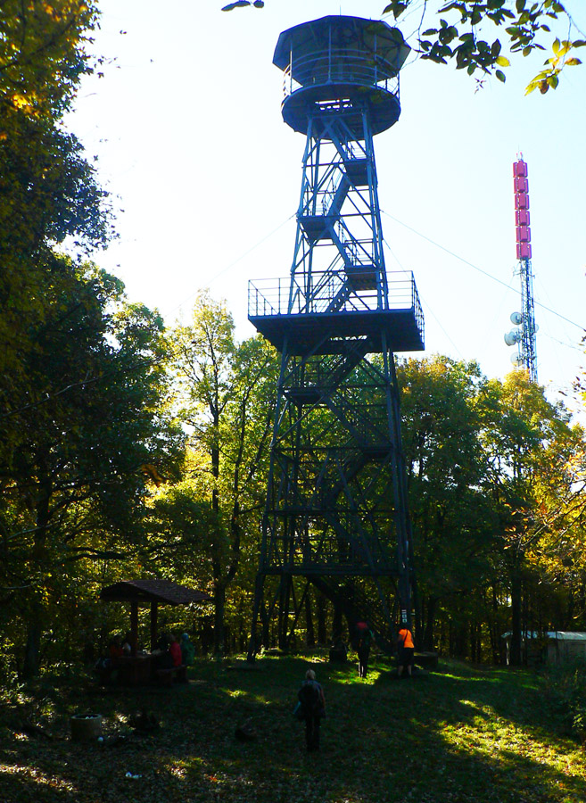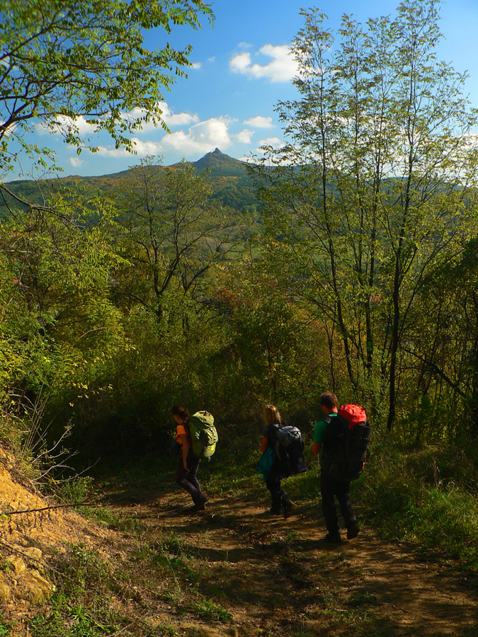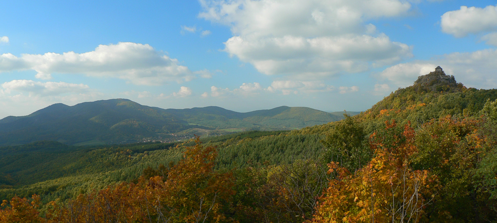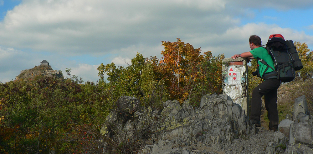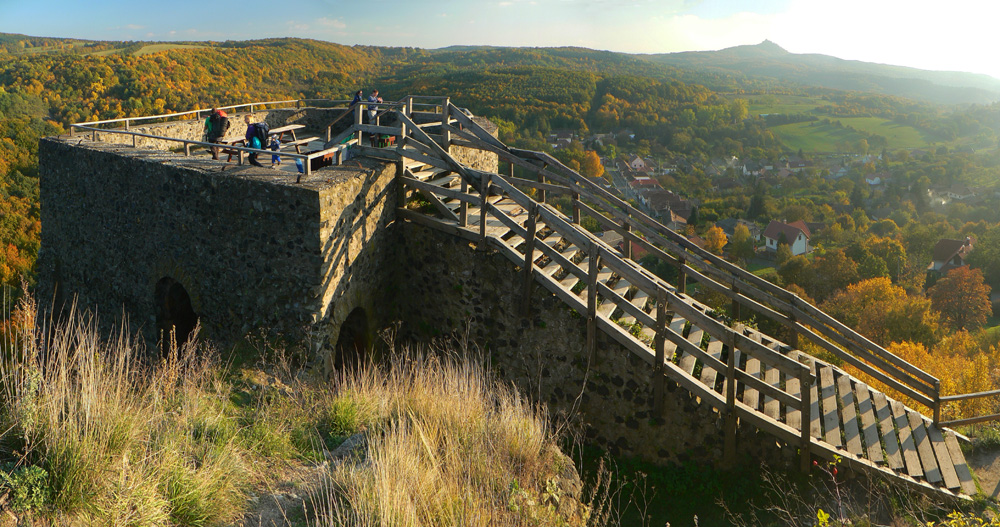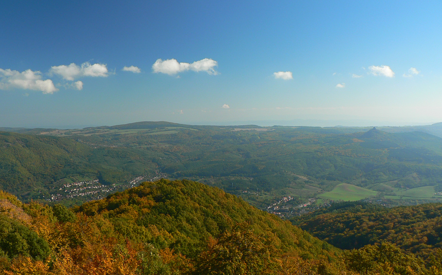 Farebná cesta lesom, na konci výživný stupák po hraničnej čiare, to sú všetky tunajšie kopčeky pod vrcholom také strmé? Ako neskôr zisťujem, sú - veď sú to sopky „bez obalu“. Na rozhľadňu na Karanči sa už bez batohov stúpa ľahko. Pod nami živé farby, v diaľkach sivé opary, nie je tento deň až taký krištáľový. Nevadí - hrad Salgó trčí viditeľne.
