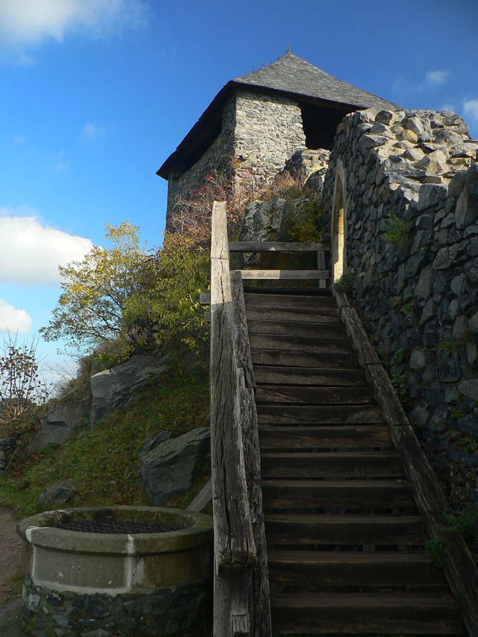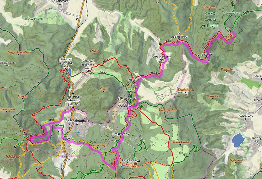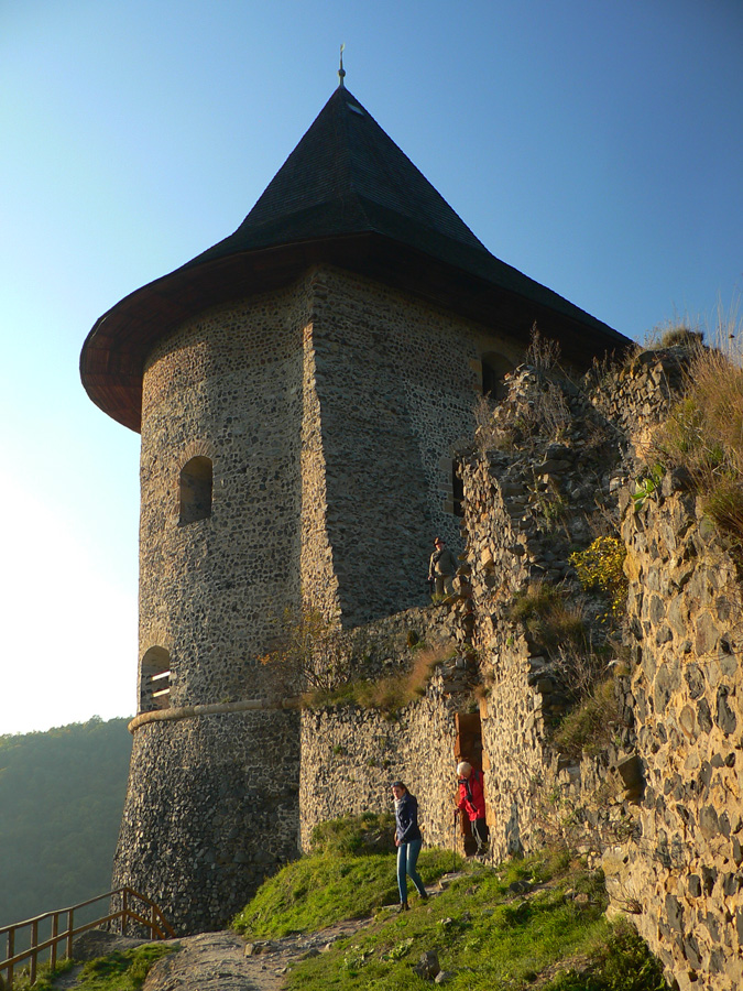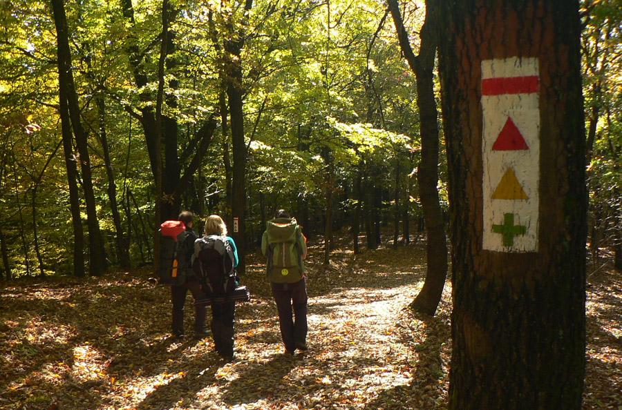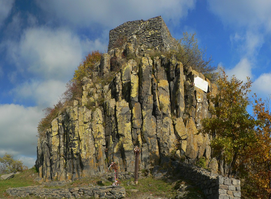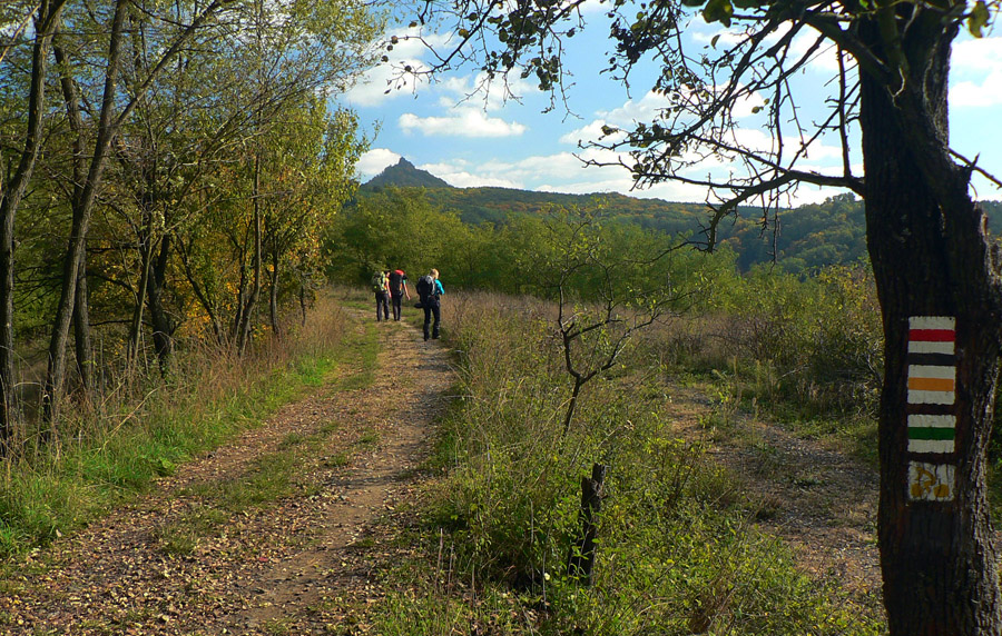 Farebná cesta lesom, na konci výživný stupák po hraničnej čiare, to sú všetky tunajšie kopčeky pod vrcholom také strmé? Ako neskôr zisťujem, sú - veď sú to sopky „bez obalu“. Na rozhľadňu na Karanči sa už bez batohov stúpa ľahko. Pod nami živé farby, v diaľkach sivé opary, nie je tento deň až taký krištáľový. Nevadí - hrad Salgó trčí viditeľne.