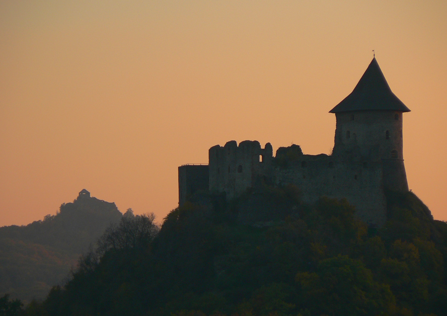 Expedičné šéfky to perfektne načasovali, rozhľadňu pod kameňolomom Mačacia dobýjame presne v okamihu, keď slnko zapadá. Aj jej stavitelia to dobre premysleli, oba hrady sú odtiaľto v perfektnom fotogenickom postavení.