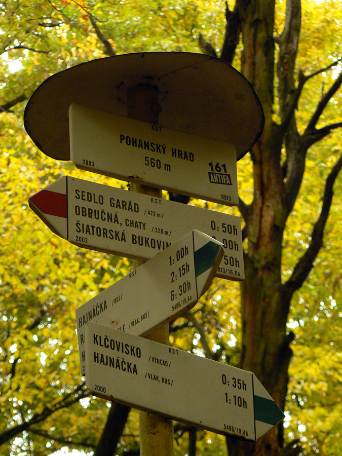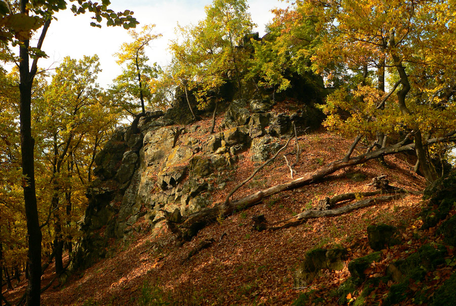 Začíname rátať hodiny do odchodu vlaku z Hodejova, tam sa musíme prepracovať popod Zabodu a cez Steblovú skalu. Obe vidno na severe. Zatiaľ máme tak hodinu rezervu, pome radšej... Strmóóó dole, riedkym lesom, celým do žlta. Akonáhle sa sklon zmierni, už sú tu zvážnice a blato a koľaje traktorové. Ešte že tie farby...