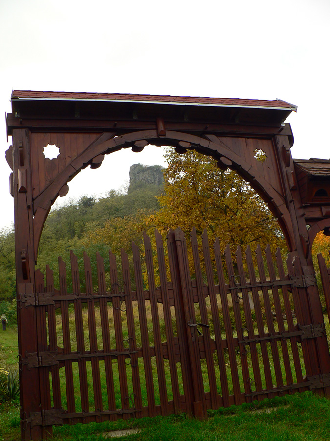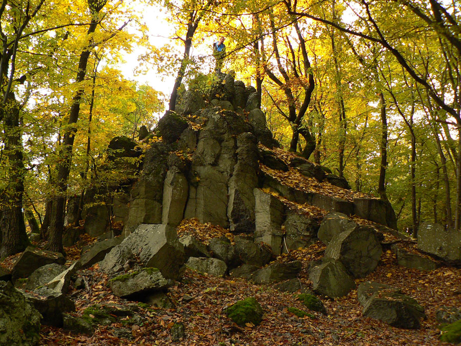 A zas hľadáme značku, lietame zo zvážnice na zvážnicu a nikde nič. Rezerva sa stenčuje, aj keď ešte stále žije. Nakoniec dáko intuitívne tú Steblovú skalu (486m) triafame. Keď už zas lezieme takmer po štyroch, vieme, že ideme správne. Hlava hore: nádherné čadičové stĺpy stoja v rade ako píšťaly organu. Nad nimi na plošinke smerovník a výhľad do doliny Gortvy, kade sa (dúfam) budeme o dve hoďky viezť vlakom.