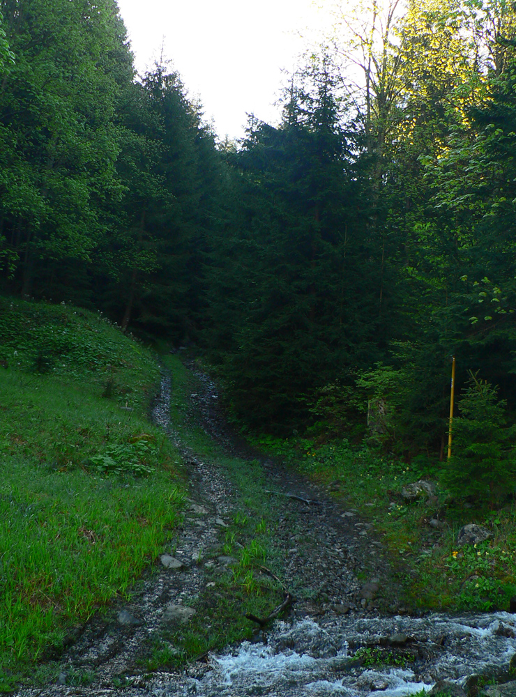 15 minút kľučkovania k rázcestníku, mením zelenú za modrú a začína zostup na Bartošku, krajinársky podobný výstupu. Čiže na úvod kľučkovanie strminou. Dookola stále viac machom obrastených balvanov, spod ktorých sa čoraz hlasnejšie ozýva zárodok potoka. Krátky úsek priamo cez žblnkotajúce pramenisko, no po prekrižovaní zvážnice je tu zrazu, akoby z ničoho, hučiaca riava.
