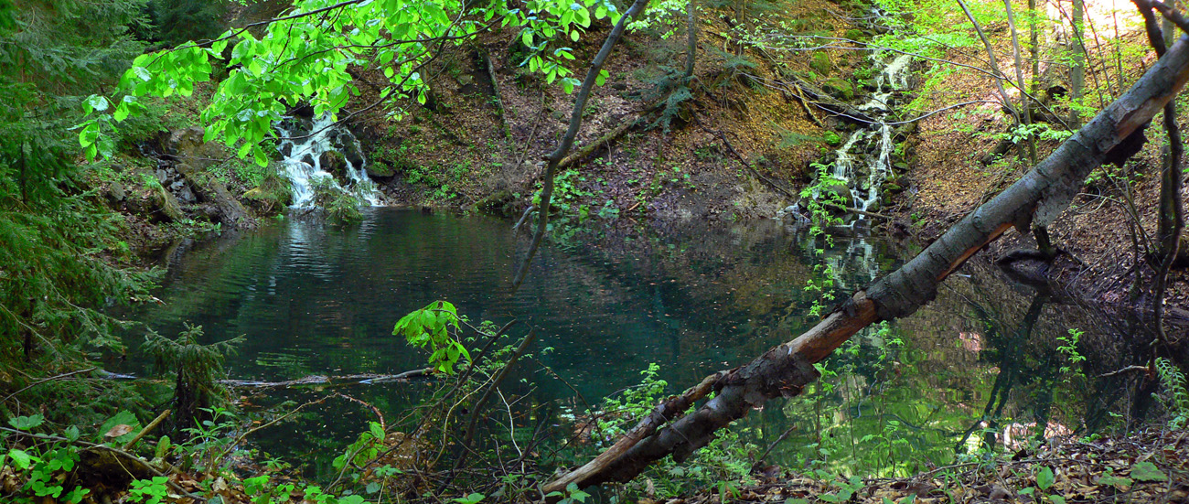 Sklon už je ľudskejší, ale hukot vody zrazu tíchne - to sme pri hornom prepadlisku. Nádherné, na pohľad hlboké a doslova čarovné jazierko – lebo dva poriadne potoky doň vtekajú, ale nevyteká z neho nič. Teda po povrchu. Je to poriadne veľký ponor a kúpanie v ňom by mohlo byť posledné. Je to napísané aj na tabuli.