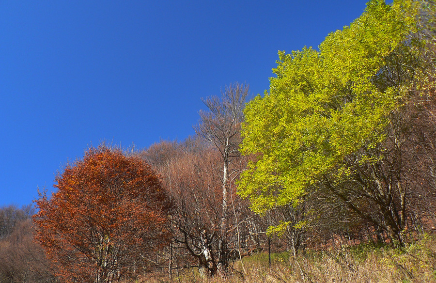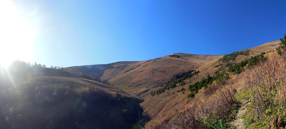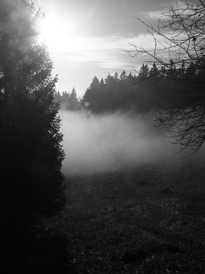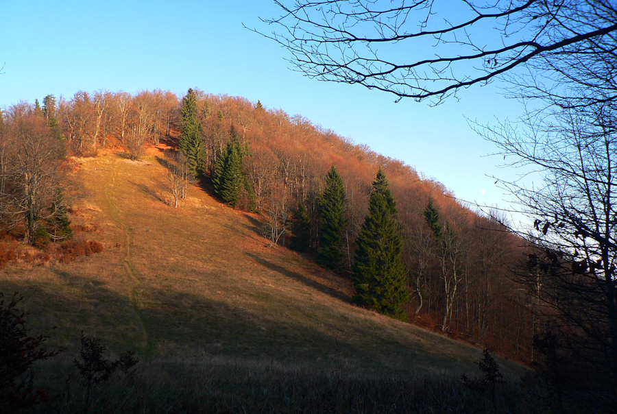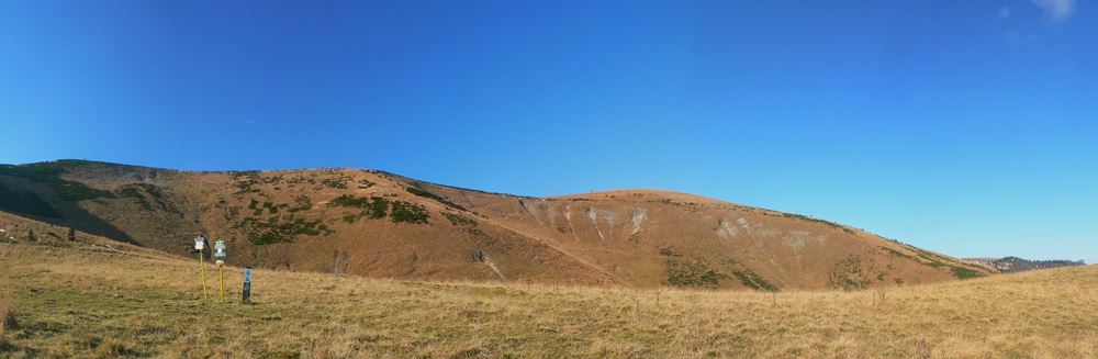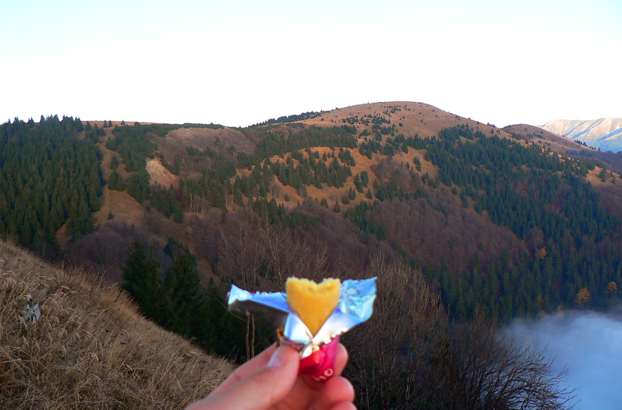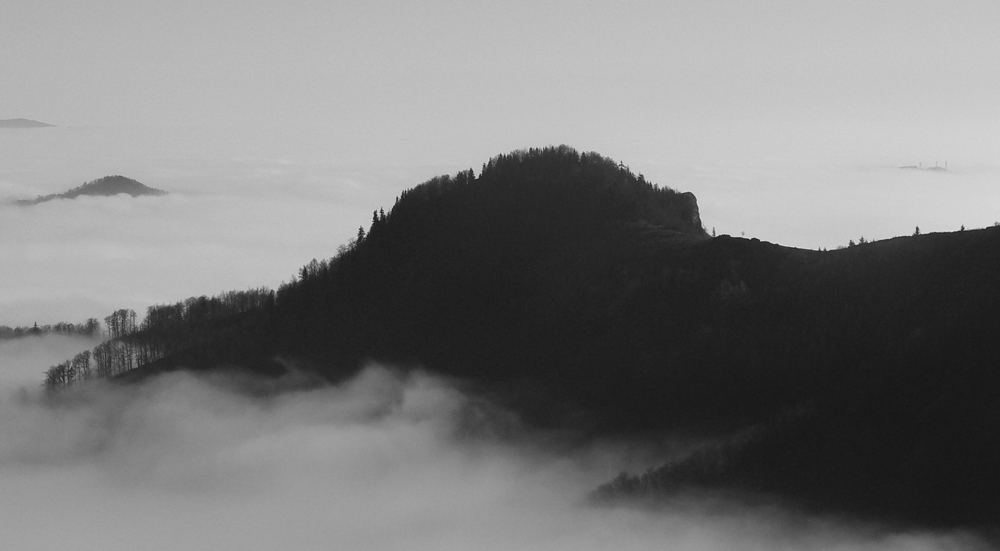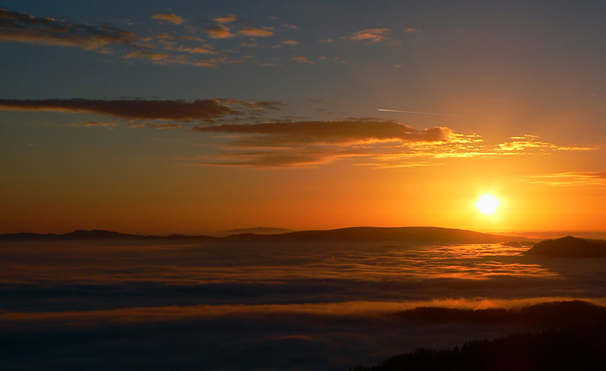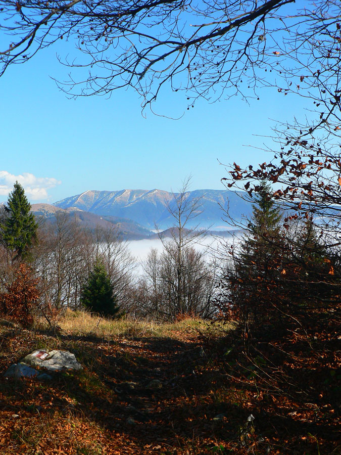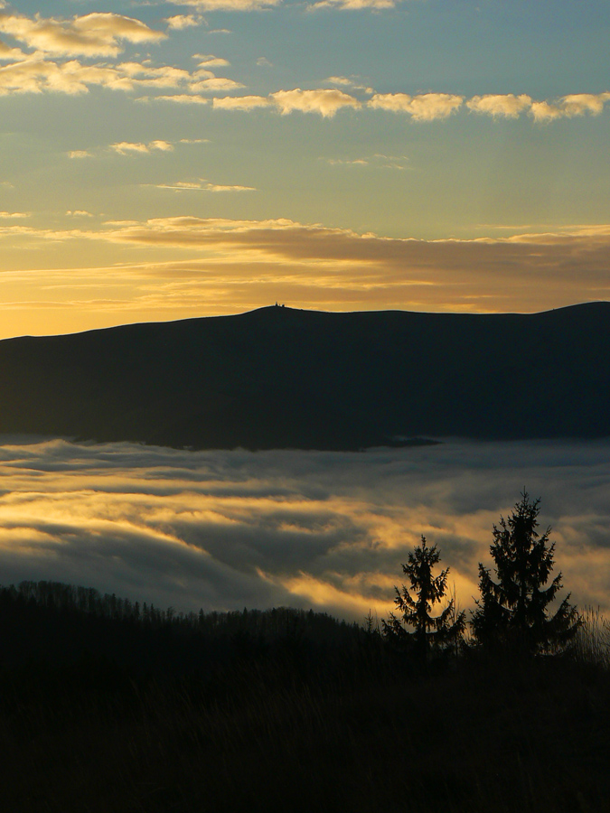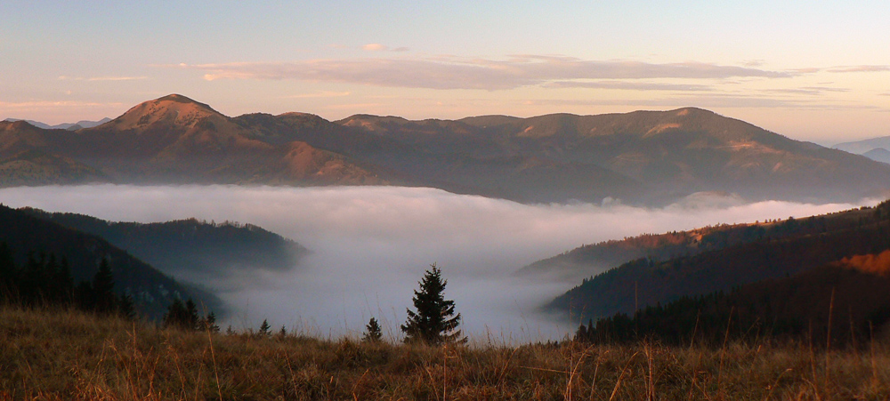 Najskôr síce len rúbanisko, ale potom už lúky okolo Motyčskej hole s výhľadmi na mliečne more na Donovaloch. Pripomína to kráter sopky pred erupciou, z hmly sa totiž nesie poriadny hukot hlavnej cesty a hladina sa hýbe vo vlnách - ako jazero lávy. Hrebeň „krátera“ tvoria Motyčská hoľa, kde sedím na okraji lúky, Zvolen, Prašivá, Kozí chrbát a Kečka. Len na juhozápad je „sopka“ otvorená, ale to mi zakrývajú stromy. Dole musí byť hnusne, veď si to večer vychutnám... Ale tu je ticho a teplúčko v zapadajúcom slnku.