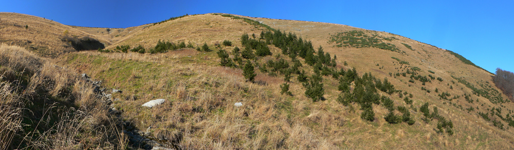 Z Krížnej na Zvolen alebo naopak to trvá asi 5-6 hodín, ale sa treba najskôr hore dostať a na konci dole zísť že? Takže to dokopy v pohode vydá na plnotučnú celodenku. Ja som začal z Liptovských Revúc, po zelenej do Rybovského sedla, lebo tade som ešte nešiel. Dolina je spočiatku mierna, neskôr sa zmení pohodlná cesta jej dnom na strmú traverzujúcu a z tej sa chytro stane nepríjemný, úzky a blatistý chodník vo svahu. Na koniec čerešnička na torte: more žihľavy. Až nad ním končí les vo východnom kotli Krížnej. Tam už je stúpanie príjemné: pomedzi skalky a zákruty rodiaceho sa potoka.
