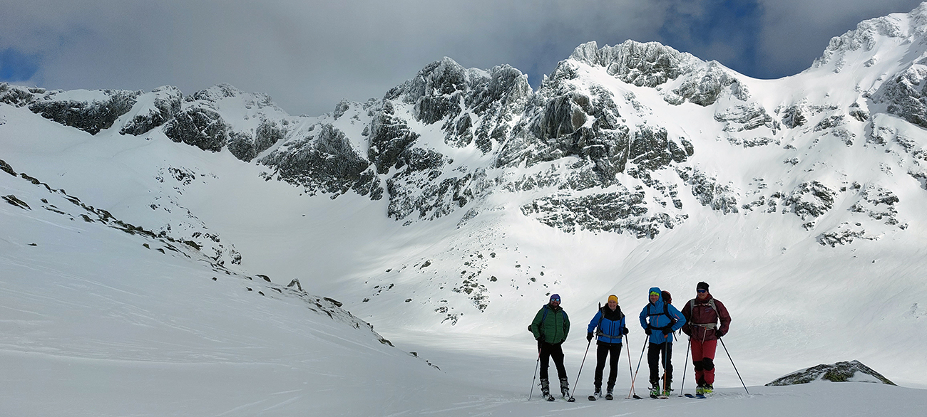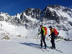 Žľab zo Sedla nad Skokom aj susedný Široký krásne nasvietené a ten druhý aj intenzívne polyžovaný, nad hlavami azúro a pohľady do doliny ako z reklamy. Len sneh už ráno začal v strmších južných orientáciách trochu lepiť. Ale plánovaným cieľom bol Kôprovský štít a tam, že sa uvidí. V doline celkom intenzívna premávka, pomaly nás obiehali partie, aj početné skupiny. Okrem Červeného žľabu hádam všade sa mrvili čierne bodky.