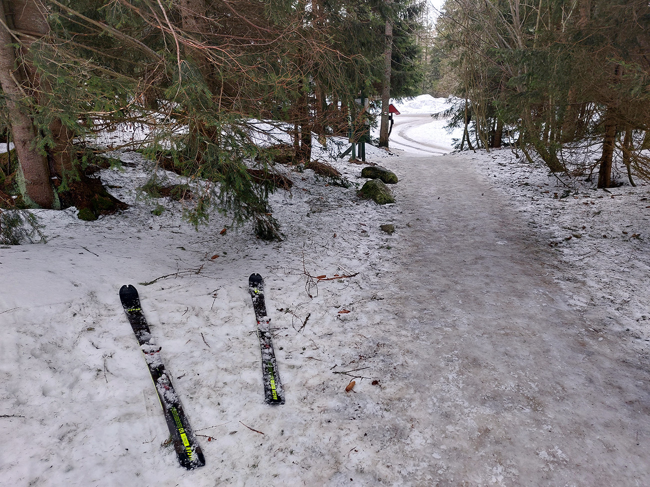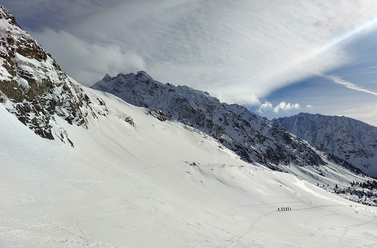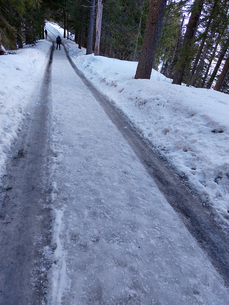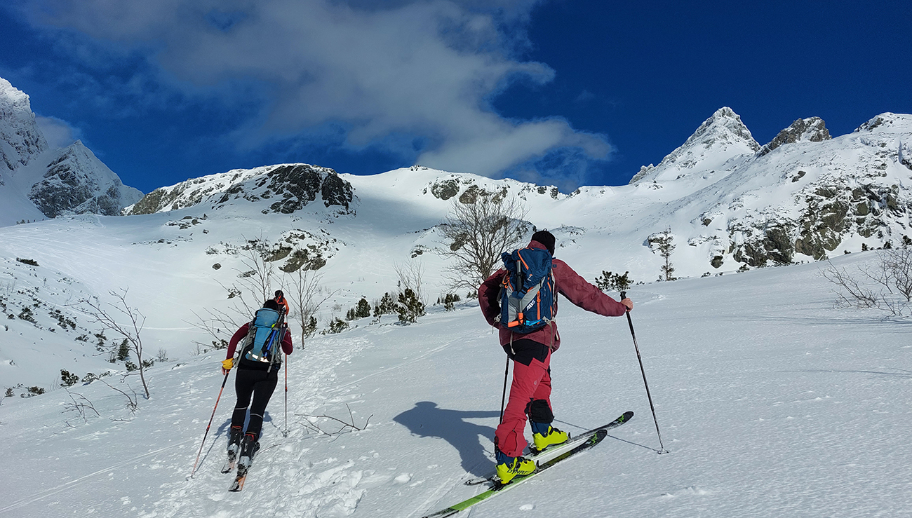 Táto superteplá zima núti ísť za snehom stále vyššie, ale stále sa dá nájsť aj ten dobrý. Tatry sú záchrana a teraz po prepršanom piatku a čiastočne aj sobote (aj vo výške Štrbského plesa) prišla jasná noc, tak sme ráno naskakovali do lyží pod Triganom (smer Popradské pleso) na betónový, viac hnedý ako biely, a poriadne hlučný podklad. Ale stále sa dá od smerovníka pri ceste. Zimný chodník (najmä zjazdík spod Triganu) ľadový, utrpenie pre pásy. Kúsok po ceste na Popradské ples – čistý ľad. Rachot spod lyží sa začal konečne zmierňovať až pri stúpaní lesom do Mengusovskej. A začali sa otvárať aj pohľady na čerstvé a poriadne veľké splazy až malé lavínky pod Patriou. Ktoré sa ale nedoplazili až na letný chodník, tak vyzeral byť bezpečný. Čo mohlo a malo, hádam už spadlo: