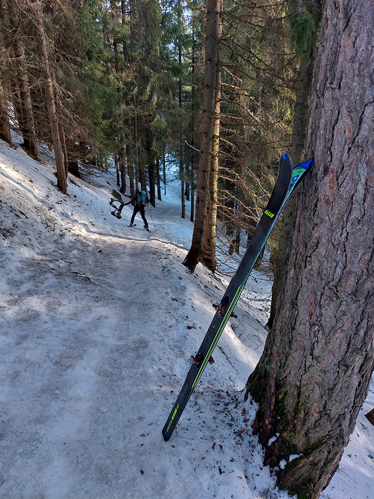 Že sme boli celkovo pomalší, neostal chuť a ani čas skúsiť niečo aj na druhom „brehu“ doliny. Ostával teda už len hravý, kľučkovací odjazd pomedzi kosovku. Mokvajúci sneh už miestami zadrhával, pod lyžami už ticho, ľady aj v lese dávno natopené, a od Popradského na Trigan sme to vzali pre zmenu komfortnejším letným chodníkom – aspoň boli výhľady. Na lyžiach potom až dole k asfaltke, aj keď za jazdy bolo niekedy ťažko rozoznať šišky od kameňov. Ale dali sme to bez jaziev.