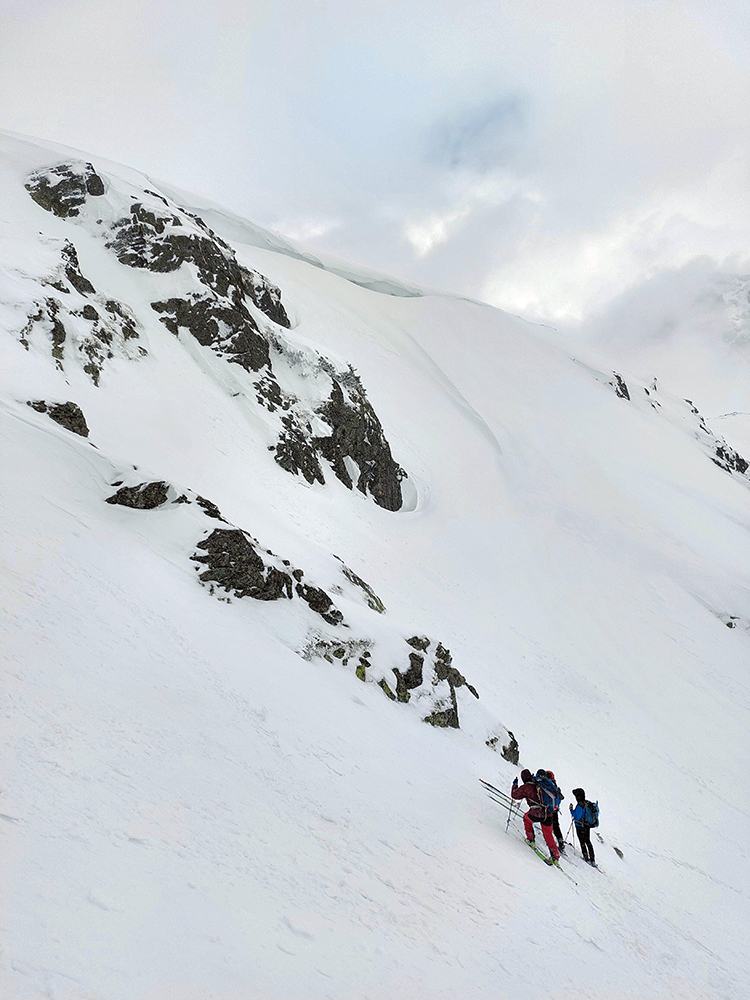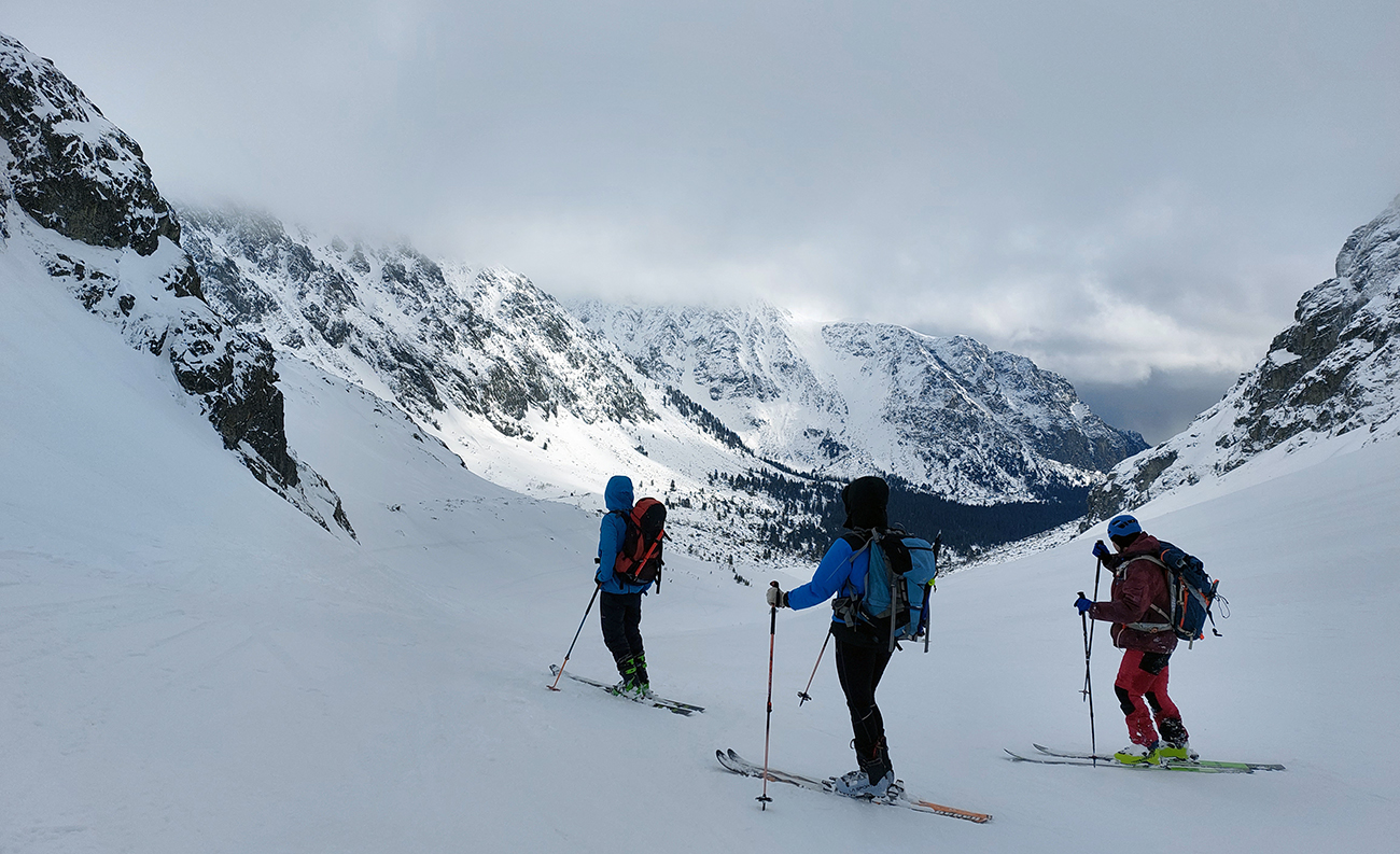 V prechode do strmého záveru výstupu pod Vyšným Kôprovským sedlom lyže na batoh. Stopy už boli, pohodlne to išlo aj bez mačiek, tuhá a pevne prilepená čerstvá nádielka poskytla takú akurát oporu. Len to už prihučali mraky, zachytávali sa stále nižšie na vrcholkoch a začínala difúzka. V sedle už poriadne fučalo, na Kôprovský už sme ani nešli, nebolo tam vraj vidieť ani na krok – hovorili tí, ktorí už sa vracali.