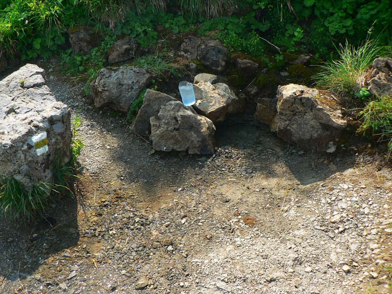 Pri rázcestí potešila informácia na smerovníku - o studničke za zákrutou. Dobre že som ju riadne využil, lebo ďalšia možnosť tankovať mala prísť až na konci, nad Terchovou. A trasa začínala byť „výživná“ – prudkým klesaním do Sedla za Kraviarskym začala séria síce nie dlhých, ale o to strmších výstupov a zostupov. Náročnosť zdôraznená hrboľatosťou, aká asi len vo vápencoch môže byť. Korene a sutina na chodníku ako bonus, za dažďa a blata to tu musí byť zaujímavé :-)