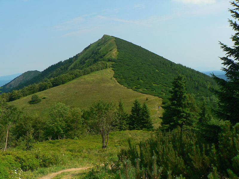 Jedno horúce júlové ráno som teda odštartoval zo železničnej zastávky v Šútove, ale tá je od vstupu do lesa dosť ďaleko - takže úvod asfaltový. Sú dve možnosti, zvolil som dlhšiu (cez dedinu), ale radšej ako po smradľavej hlavnej. Smer Šútovský vodopád - tadeto je to hore na Chleb príjemnejšie ako po zelenej, po „Generáli“, na ktorý už zrána praží slnko. V doline pri vodopáde akurát vrcholila jar, mesačnice voňali o 106, nad lesom zas prudko rozkvitli lúky. Voda sa dá dotankovať cestou na hrebeň, na Mojžišových prameňoch. Tam sa dá aj reuma liečiť, lebo chodník je tam úzky a žihľava dobre narastená :-) Stúpanie je okolo prameňov strmé a až príliš slnečné a v závetrí. Takže keď za posledným horizontom vykukol Chleb, nešiel som traverzom popod neho k chate, ale doprava hore na hrebeň, do Sedla za Hromovým. Predpoklad sa naplnil – dobre tam fúkalo. Hneď bol svet krajší! Aj výhľady: ako na dlani Vrátna dolina a jej západná obruba, ktorú som sa chystal prejsť. Predo mnou pekne po poradí Chleb, Veľký Kriváň, viac vpravo Kraviarske, Žitné, Baraniarky a celkom vzadu Sokolie. Ale všetko v opare, vlhko bolo ako v práčovni, obloha biela, fotky nič moc, čo už... Počkáme na babie leto.