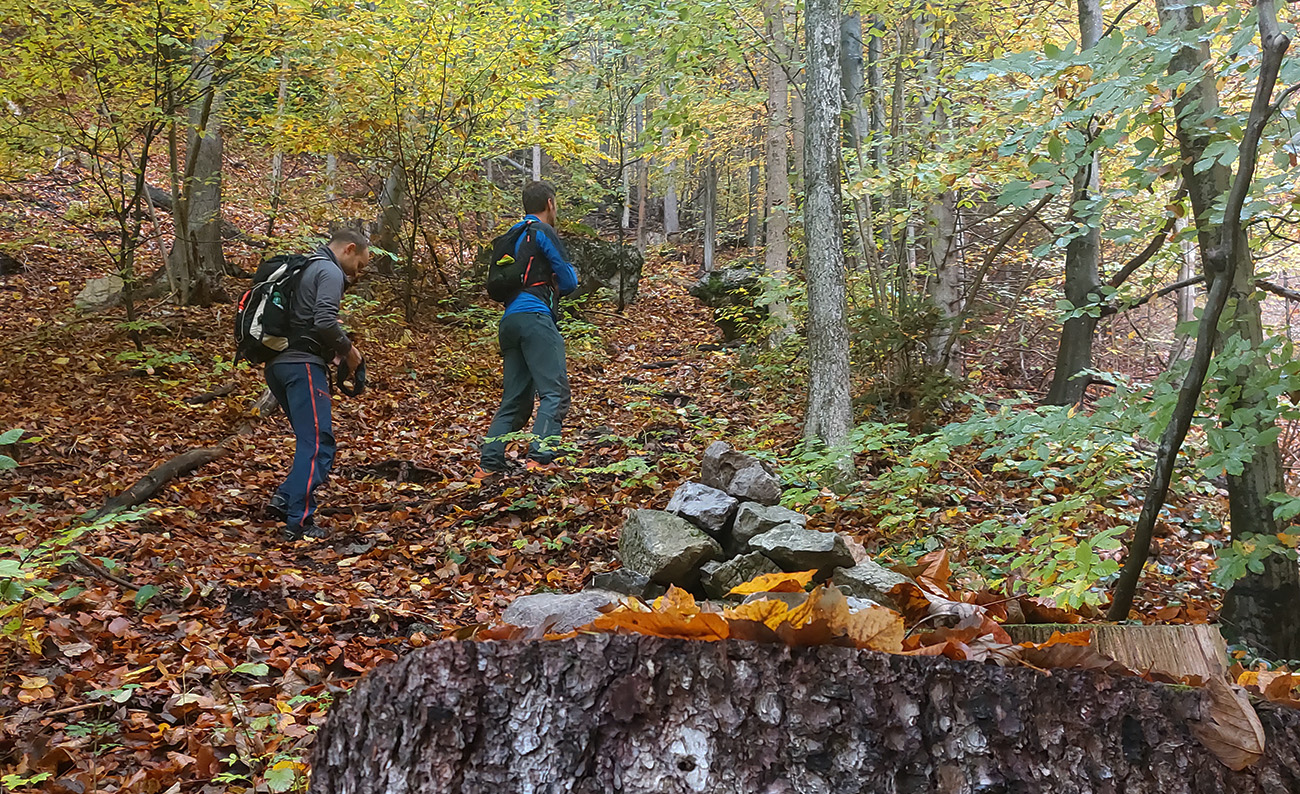Obzeráme sektory najskôr doprava, potom sa presúvame doľava, na juh. Využívame nádhernú vyhliadku nad najjužnejším sektorom Rakytovo. Je tam plno bobkov, aj medvedie oné sa nájde, miestne zverstvo sa sem zhusta chodí opaľovať, to je jasné. Oproti máme výhľad priamo na vstup do Harmaneckej jaskyne, pod nami hučí cesta na Šturec a v doline sa krčí Dolný Harmanec. Ešte tadeto samozrejme každé dve hodiny hučia rýchliky, míňajúce sa pri „jaskyni“, a občas nákladný vlak. Inak je tu parádny pokoj. A tentokrát je aj krásne farebne, tak októbrovo, vo vetre husto pršia bukové listy. Ešte že nesvieti slnko, tie farby by nám vypálili oči.