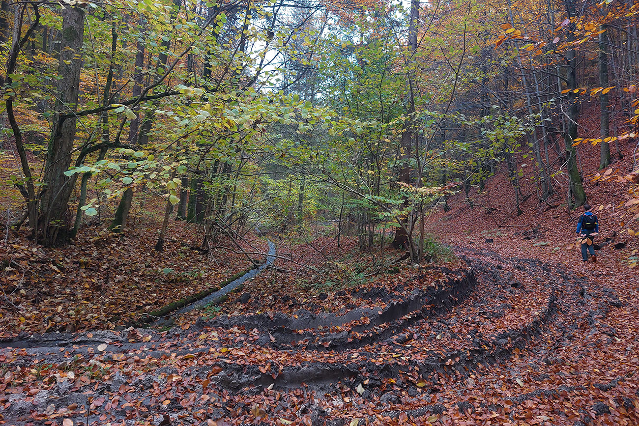 Z vyhliadky sa vraciame kus na sever a nachádzame starú lesnú cestu, ktorá mierne klesá traverzom, mení sa na chodník a neomylne nás privádza na horný okraj Harmaneckého vodného žľabu. Potom už, miestami čvachtajúc, miestami žľab preskakujúc, ideme popri ňom dole, obdivujúc skalky, lesy, žľab samotný, ale aj traktoristu, usilovne miesiaceho blato a ťahajúceho kmene. Ešte pred nami prehučí cez Grehelské tunely jeden rýchlik, poskúšame, ako to drevo dole žľabom letí (tomu sa hovorí detská radosť), dole v studničke poumývame ruky a popri elektrárni, peknej mokradi a odparkovaných miestnych endemitoch Praga V3S uzatvárame okruh a ideme druhý raz poškrabkať mačkopsa. Sľuboval som síce aj salamandry, ale asi už bolo pre ne zima, tak len tá jediná, na ceste zabitá, sa vyskytla. No nič, nabudúce, aj tak fajne bolo...