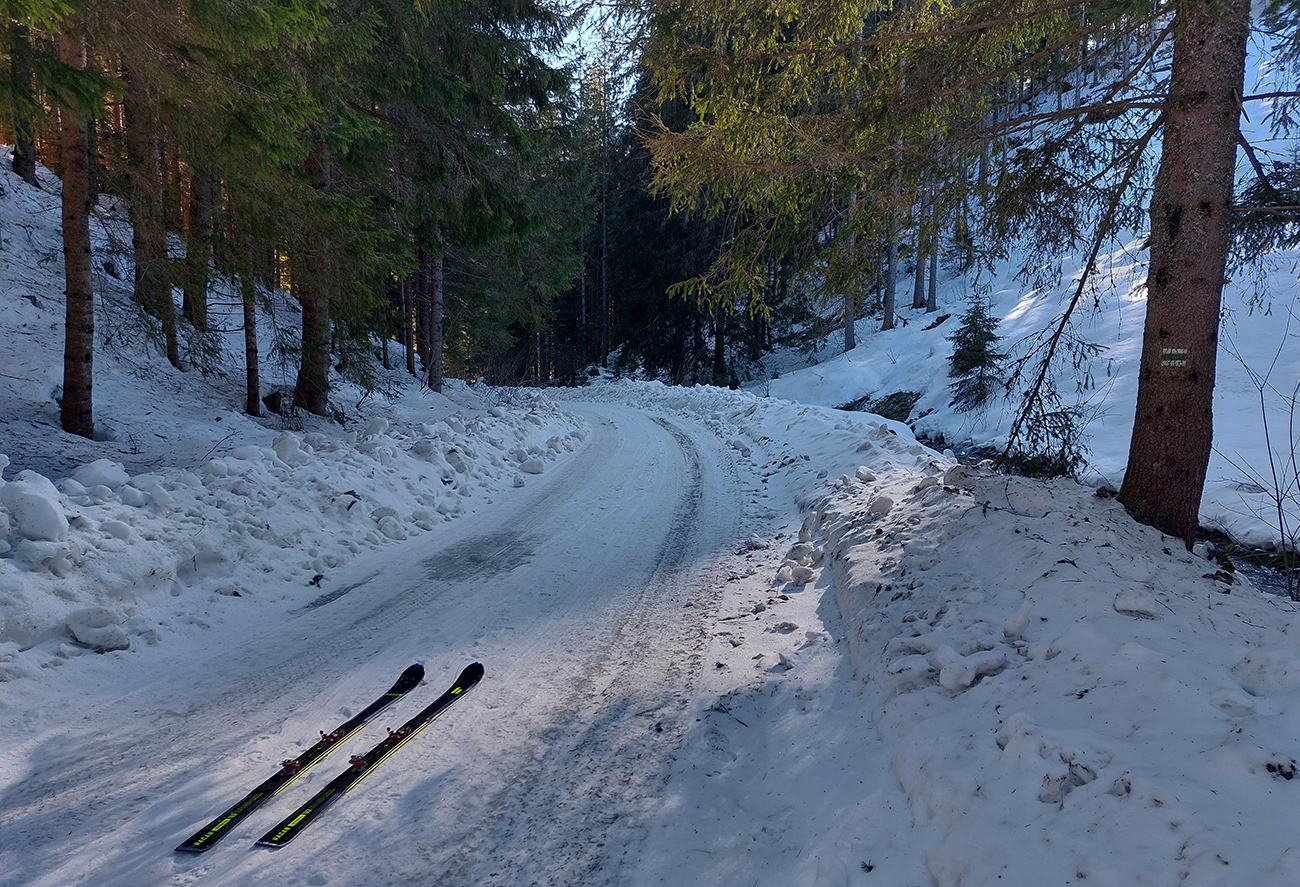 Ako sme minuli odparkovaný harvestor, cesta obelela, tak sme to skúsili na pásoch, ale o chvíľu išli lyže zase na chrbát, až po horný koniec Magurky. Aspoň sme si poobzerali odbočky a trochu hádali, ktorá z nich nás nazad na túto cestu vypľuje na konci. A potom sme si poobzerali domčeky a iné artefakty Magurky a „s piesňou na perách“ sme konečne nastúpili do lyží a do Viedenky.