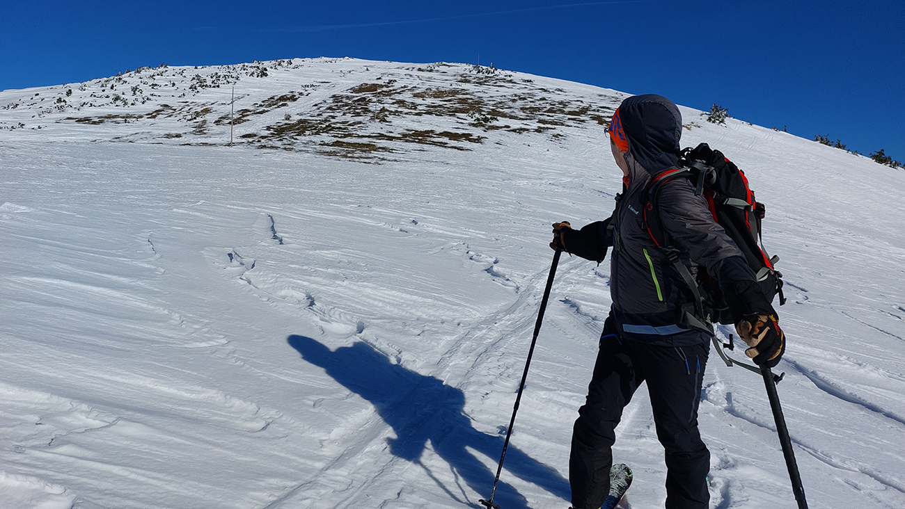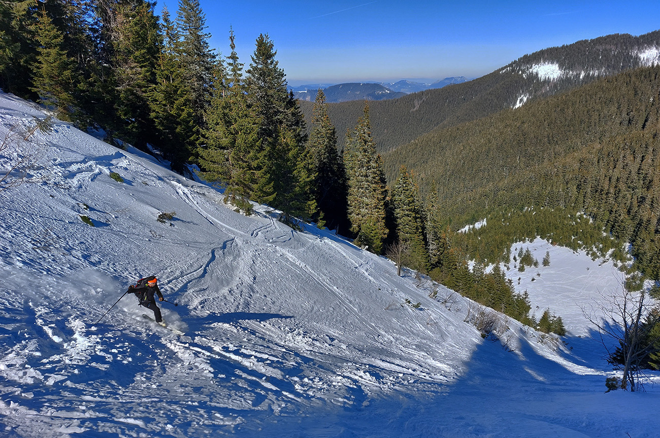 A tam samozrejme dilema, že kade hore. Zhodli sme sa napokon, že to vezmeme zľava a keď sa vyššie rozkukáme, uvidíme čo ďalej. Napokon sme to tam otočili dvakrát. Prvá jazda v parádnom prašane na tvrdom podklade, priamo do severu. Druhá trochu horšia o „zjazdovku“ vedľa, aj nejaké kôrky už za nohy ťahali, orientácia svahov už hrala podstatnú rolu. Ale slniečko sme videli po dlhej dobe konečne inak ako len cez okno pracovne, to bolo hlavné. A teplota ideál, aj vietor len osviežoval, nemrazil.
