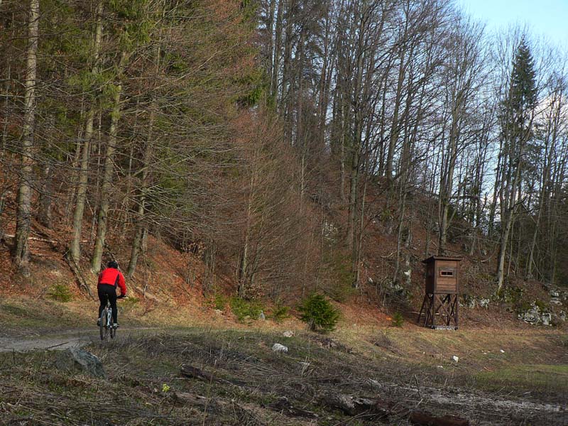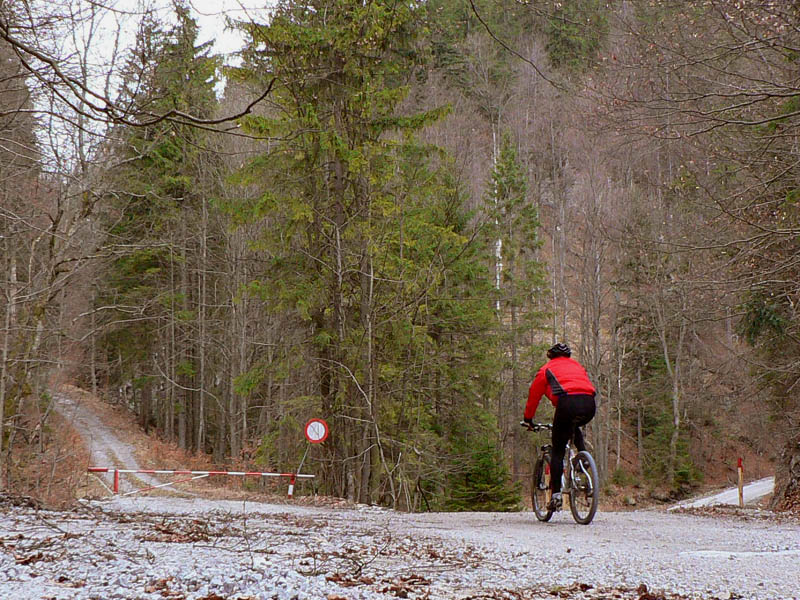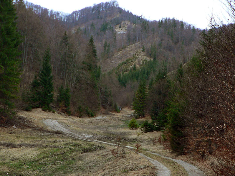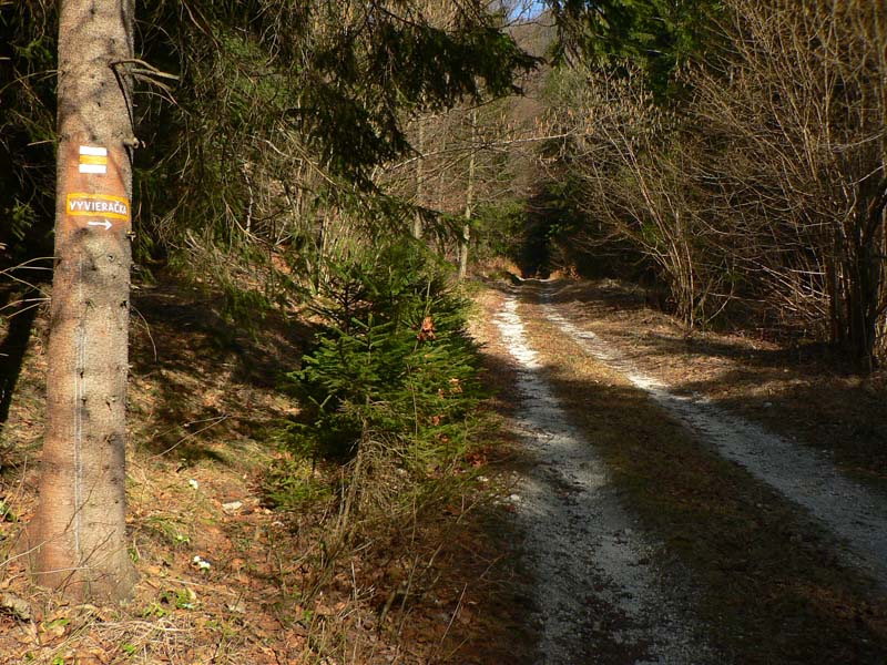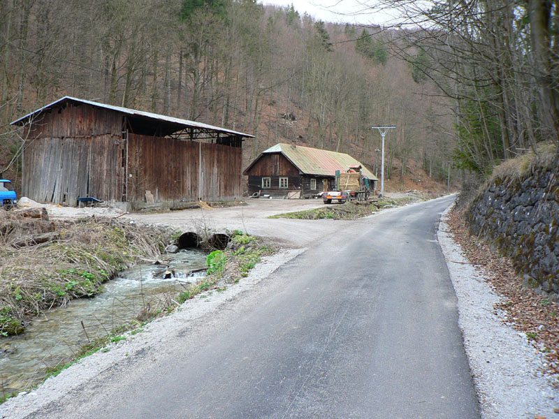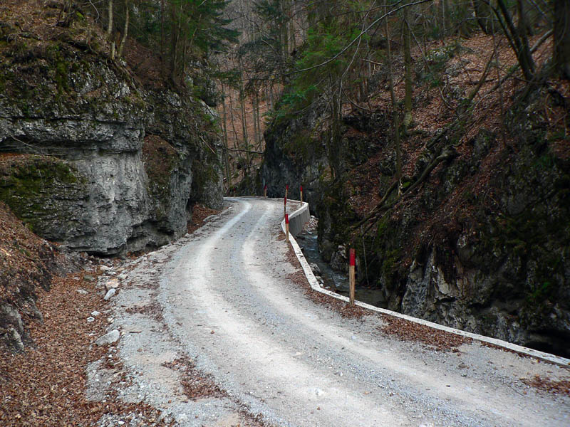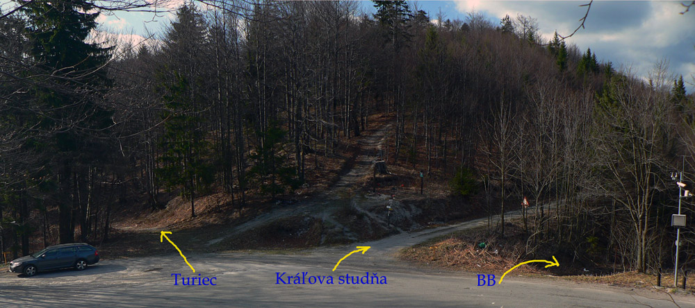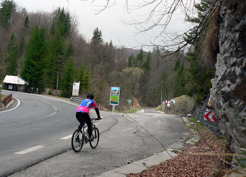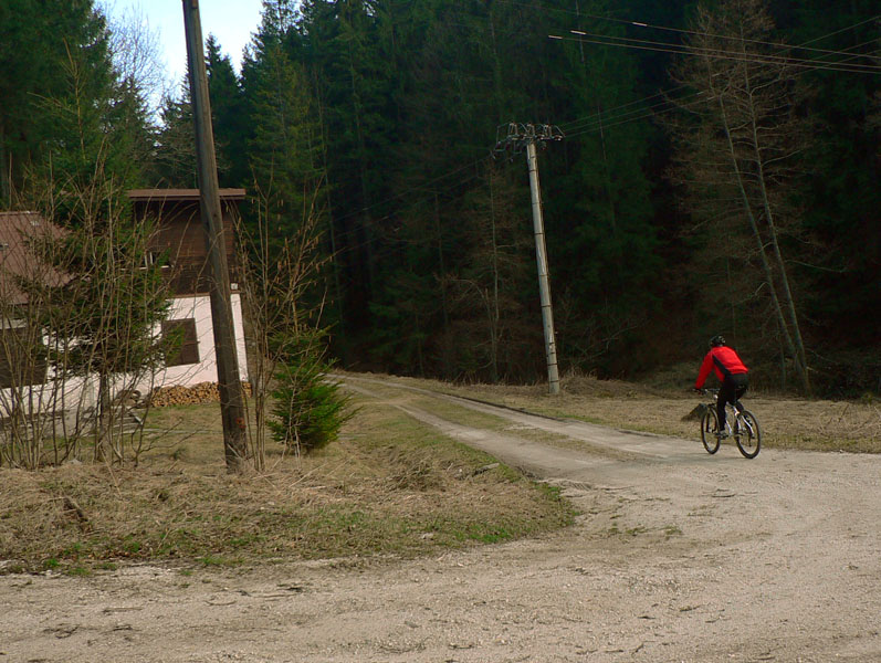 Cesta, o ktorej je reč, sa od hlavnej odpája kúsok nad železničnou stanicou Harmanec – jaskyňa (nejakých 600m n.m.) a dva kúsky od parkoviska pri jaskyni. Najprv sa chvíľu mierne vlní dolinou po vynovenom asfalte (pozor na brešúcich achilovkárov, strážiacich lesnícke kone), naberá sklon, míňa rezerváciu Harmanecká tisina, najdlhší železničný tunel u nás, skalné bralá vpravo, vľavo, prosto je čo obzerať. Za podjazdom medzi tunelmi sa mení na šotolinovú a opúšťa zelenú značku prudkou zákrutou doľava. Tu je to asi najkrajšie, o chvíľu aj najužšie pomedzi bralá a trochu strmšie. Pozor na „autoturistov“ – je to zároveň prístupová trasa k horskému hotelu Kráľova studňa. O kus vyššie na križovatke so Zalámanou dolinou treba prehodiť bajk cez rampu, nasleduje pár stoviek strmých metrov, ďalší malý kaňon a dolina sa otvára, sklon sa zmierňuje. Tu už ťažia (a hlavne zvážajú) drevo, podľa toho cesta miestami vyzerá. Vľavo nad hlavou hučia autá, vpredu v diaľke vidieť senník a vysoko nad ním v záreze ďalšiu cestu na Kráľovu studňu, tentoraz tú zo sedla. Za senníkom sa cesta skrúca doľava do bukového lesa a niekoľkými strmými serpentínami stúpa do sedla. Že sa blíži parkovisko je jasné, hádajte podľa čoho :-(
