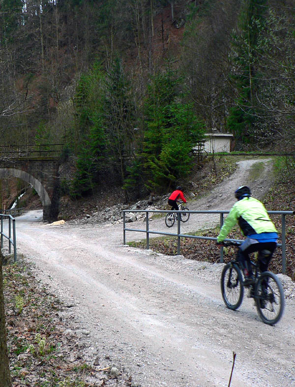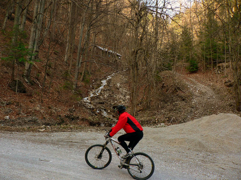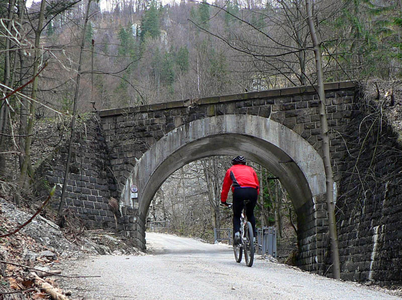 Hore v sedle (približne 900m n.m.) sú dve možnosti, ak nerátame asfaltku: po zvážnici smer Kráľova studňa alebo pokračovanie starou cestou (inak žltá TZT) dole kopcom. Na začiatok len jedna serpentína, pozor na konáre pod hrubou vrstvou bukového lístia. O chvíľu je to už ale len rovný zjazd dolinou Bielej vody po čoraz civilizovanejšej lesnej ceste, spestrí to prejazd okolo ústia vetracej šachty toho nášho najdlhšieho tunela. Riadny komín je to! Bystrická strana cesty je vďaka bralám pestrejšia a strmšia, toto je na taký rodinný výlet. Cesta ústi na hlavnú pri horskom hoteli Bartoška, kúsok nad železničnou stanicou Čremošné. Posledný kilometer je to dokonca do kopca, kto by to čakal?