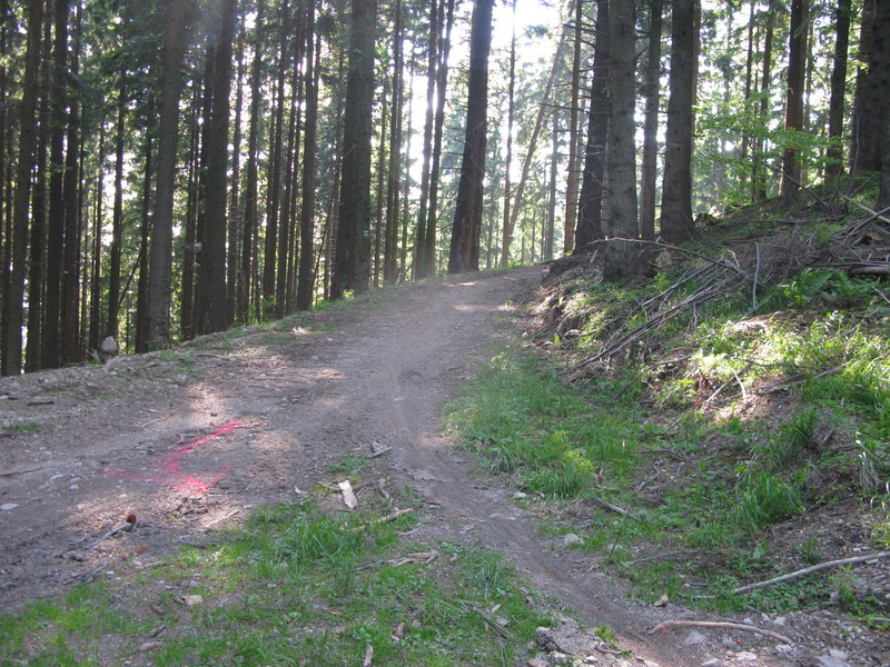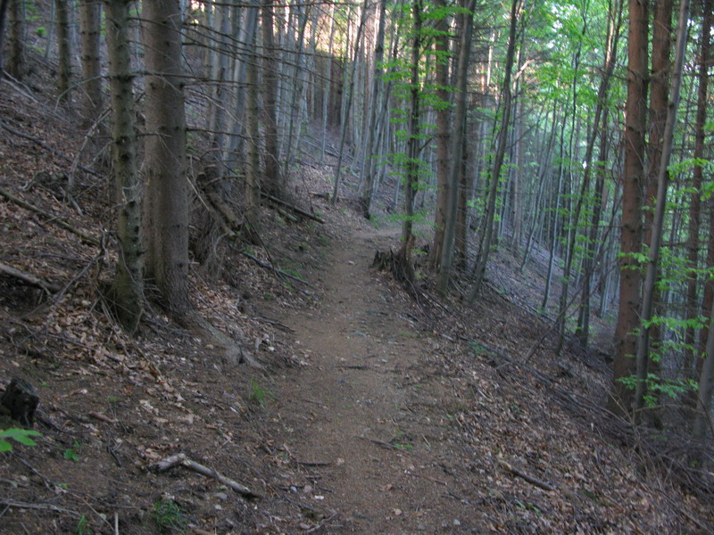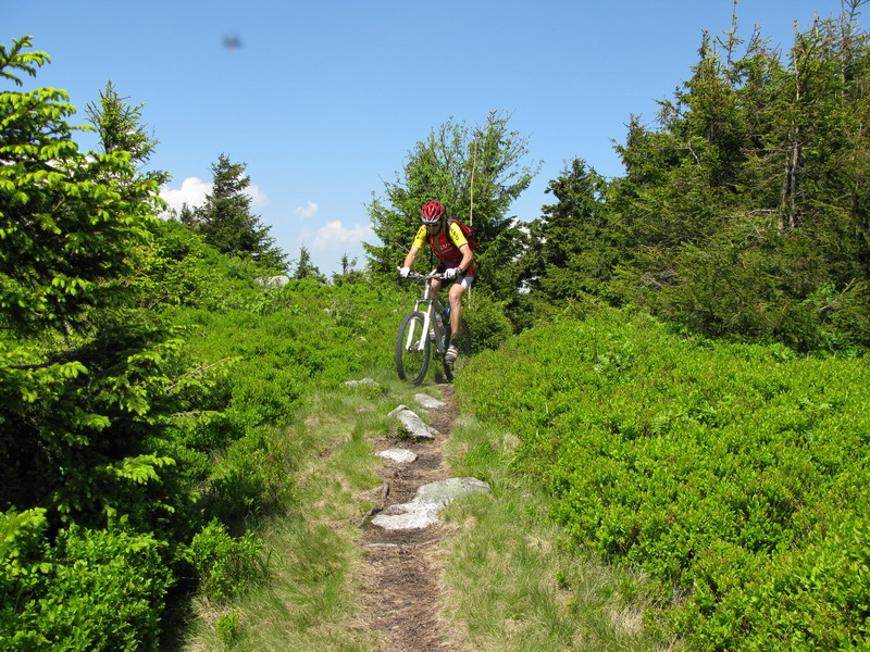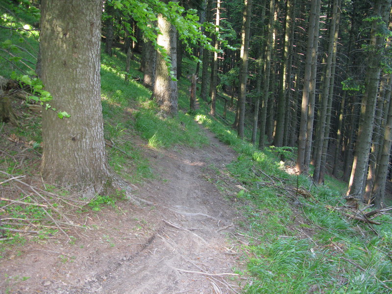 Vraciam sa späť na Minčol. Cestu do sedla Javorina už poznám a nie je pre Jazdca dostatočne zaujímavá, vyberám si preto modrú značku smerom do Višňového. Tam sa chcem napojiť na trasu maratónu, ktorý tu bol pred pár dňami. Začiatok zjazdu je nádherný, v lese sa však z chodníka stáva spádnica - kolmo dole. Nevadí, všetko sa dá jazdiť a po chvíli konečne prvý dlhší traverz. Je to paráda, ani raz som nemusel zosadnúť.
