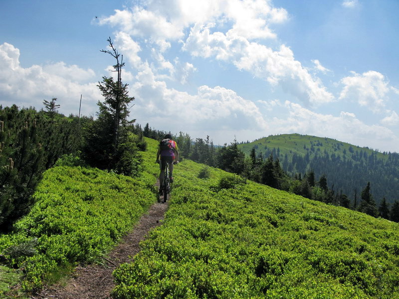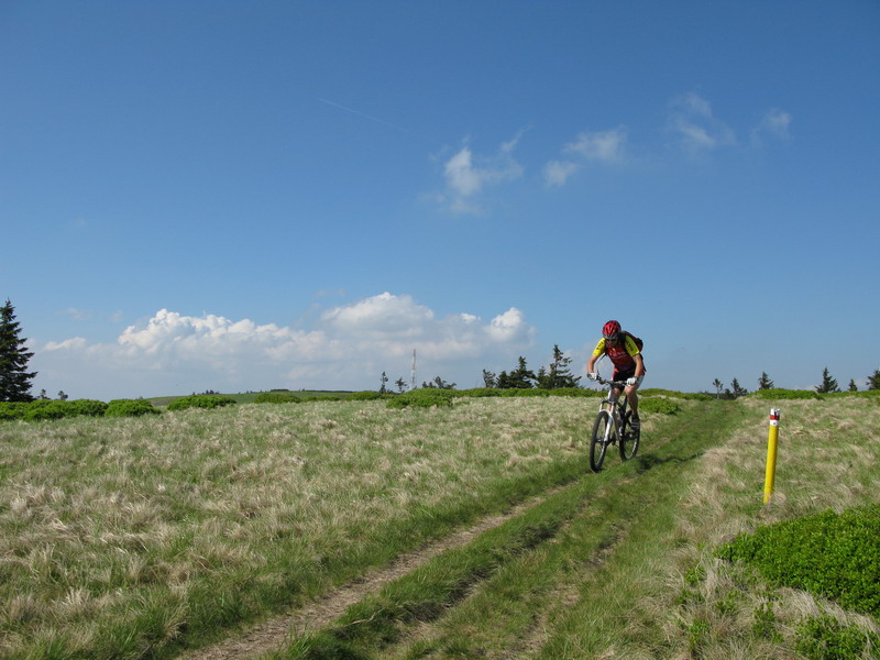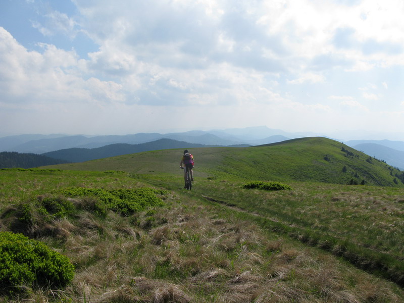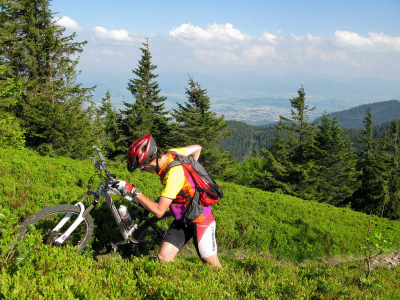 Striedavo tlačím a šliapem po zvlnenom hrebeni, keď zbadám v diaľke vrchol. To musí byť Minčol. Za chvíľu som tam, bike poskytuje úžasné zážitky, keď sa s ním citlivo narába. Vychutnávam si výhľady, zo Strečna som prišiel za dve hoďky, tak ide sa ďalej. Najprv zjazd, potom lesík, lúka a záver striedavo v sedle a tlačiac sa dostávam ku vysielaču. Ešte nemám dosť a tak šliapem ďalej, až po Veterné. To je teda hodné svojho mena.