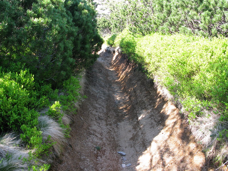 Tlačenie strmým svahom chvíľu potrvá, kým prídem na hrebeň. Podobné kombinované túry sú v Alpách úplne bežné. Podstatné je, aby sa to vyplatilo a zjazdné pasáže prevládali. Na zemi vidím stopy, začudovane pozerám. Títo jazdci neboli slabí, a myslím na bajkerov, ktorí tadiaľto pravdepodobne zjazdovali dole.