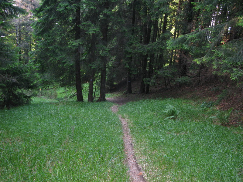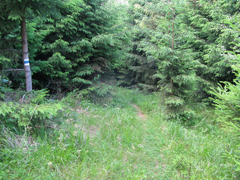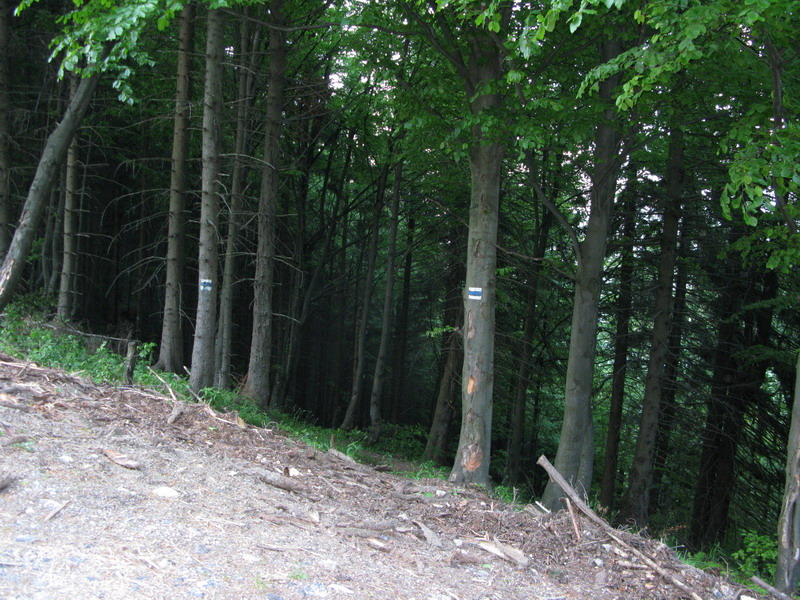 Tlačím bajk po rozrytej ceste. Míňam vyvalený strom s modrou značkou. Mŕtvou modrou značkou. Nefotím. Po chvíli sa dostanem znovu do lesa a nachádzam podľa zvyškov značenia trasu maratónu. Po nej sa dostanem naspäť do sedla Javorie. Uzatváram okruh a tu ma čaká posledná úloha dnešného "výletu" Záhadná modrá značka vnárajúca sa do lesa. Všimol som si ju už minule a neskôr som ju nenašiel na žiadnej mape.