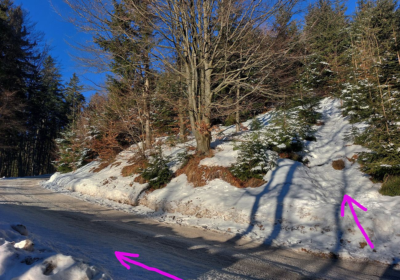 Potom už len zjazdovka a snaha nejako to obabrať lesom, aby som nemusel na serpentíny popri ceste, ale toto nevyšlo. Snehu v lese síce dosť, len rúbaniská dáko zarástli. Tak som sa už len pešibusom prebojoval na odbočku k partizánskemu bunkru a takisto peši až dole, rovnako ako hore. A ten pocit dole skratkami, keď sa prsty tlačia von z lyžiarok... Už nech napadá voľačo!