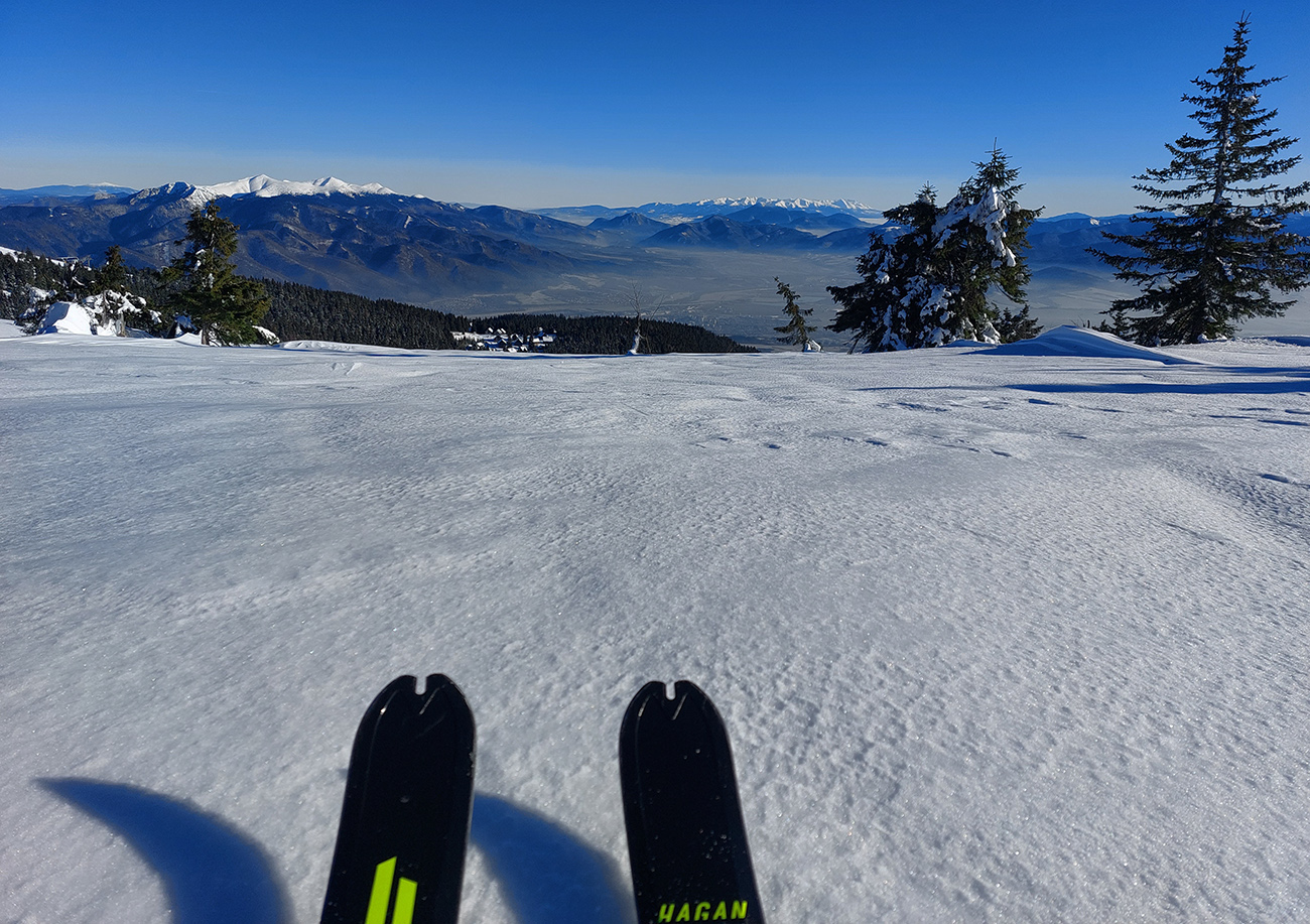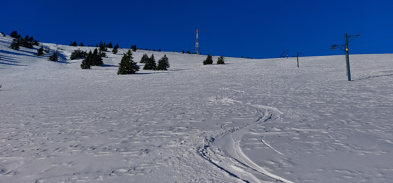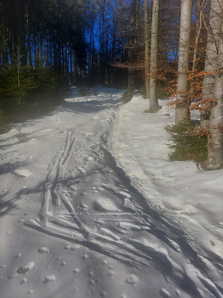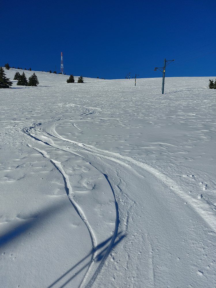 Druhý raz to isté po susednom rebre, kúsok na juh, trochu lepšie, lebo menej kôrky a namiesto nej taká husto ufúkaná doska. Tretí raz som začal pod Vidlicou, v ústrety teplárenskému komínu, a skončil som hlbšie v lese, až na modrej značke z Bystričky, lebo kompaktný les je tam pekný, vysoký, dospelý, a teda dosť riedky. Dalo sa preštrikovať pomedzi stromy relatívne komfortne, po zamrznutom firne, ktorý dobre drží. Potom znovu na Vidlicu popri spodnej stanici vleku, napojac sa na predošlú stopu.