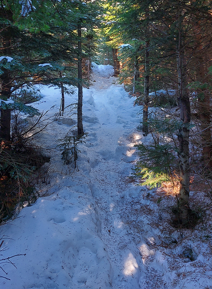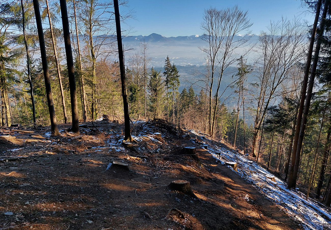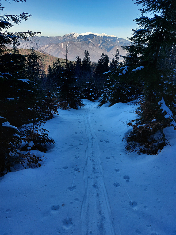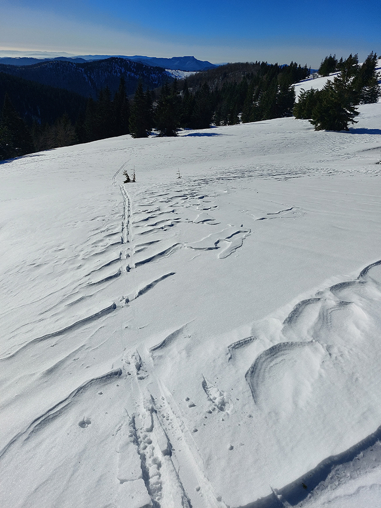 Druhý raz to isté po susednom rebre, kúsok na juh, trochu lepšie, lebo menej kôrky a namiesto nej taká husto ufúkaná doska. Tretí raz som začal pod Vidlicou, v ústrety teplárenskému komínu, a skončil som hlbšie v lese, až na modrej značke z Bystričky, lebo kompaktný les je tam pekný, vysoký, dospelý, a teda dosť riedky. Dalo sa preštrikovať pomedzi stromy relatívne komfortne, po zamrznutom firne, ktorý dobre drží. Potom znovu na Vidlicu popri spodnej stanici vleku, napojac sa na predošlú stopu.