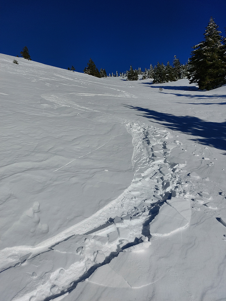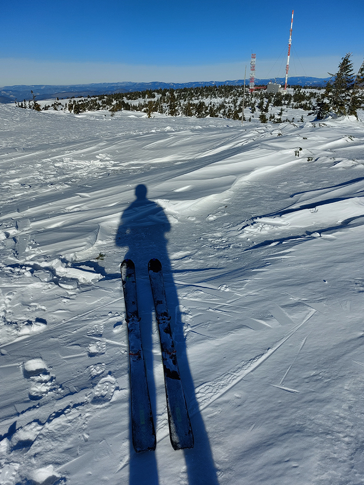 Pretože po hrebeni to samozrejme nepríjemne hrkoce, skúsil som radšej sériu kratších lyžovačiek, postupne na východ, juh a západ, ako sa slnko posúvalo. Lebo ráno krutých -12 dole v kotline a hore tiež nie teplejšie. Ale bez vetra a slniečko dole v jamách pri naliepaní príjemne hrialo. Takže prvá lyžba z Veľkej lúky popri vleku Javorina, do lesa. Hore drsný škrípavý firn, nižšie trochu ufúkaných vlniek, len medzi prvými stromami trochu prášku, ale tam už lyžovateľný sklon končil.