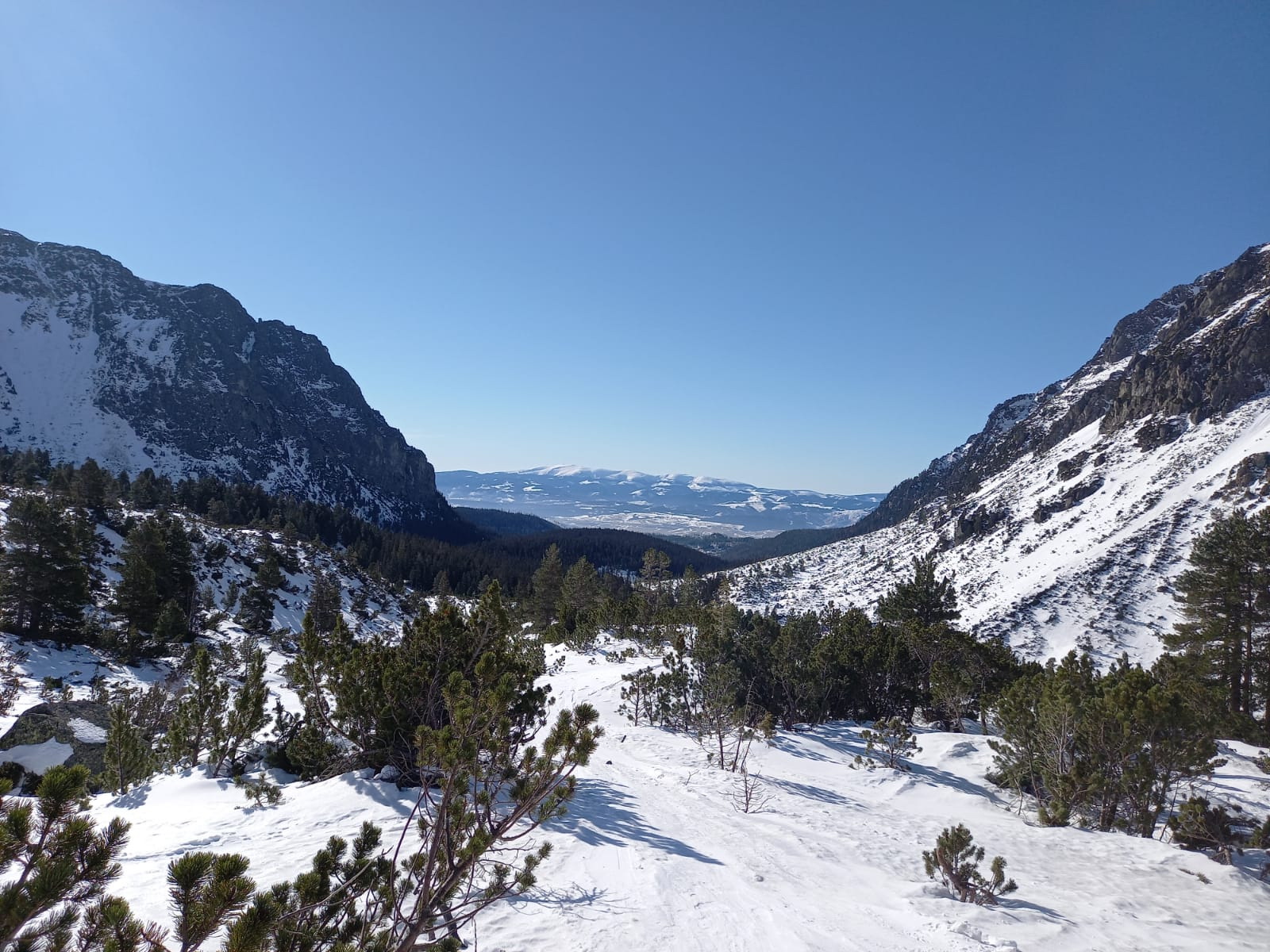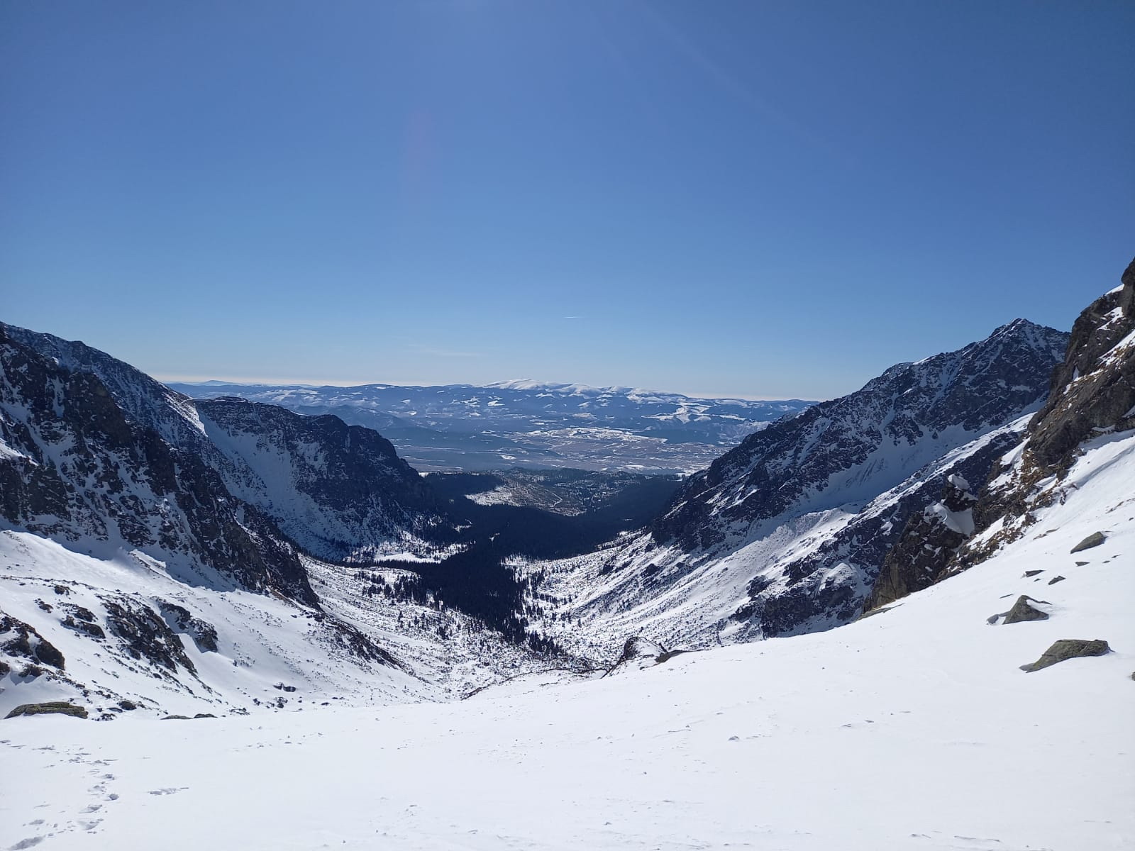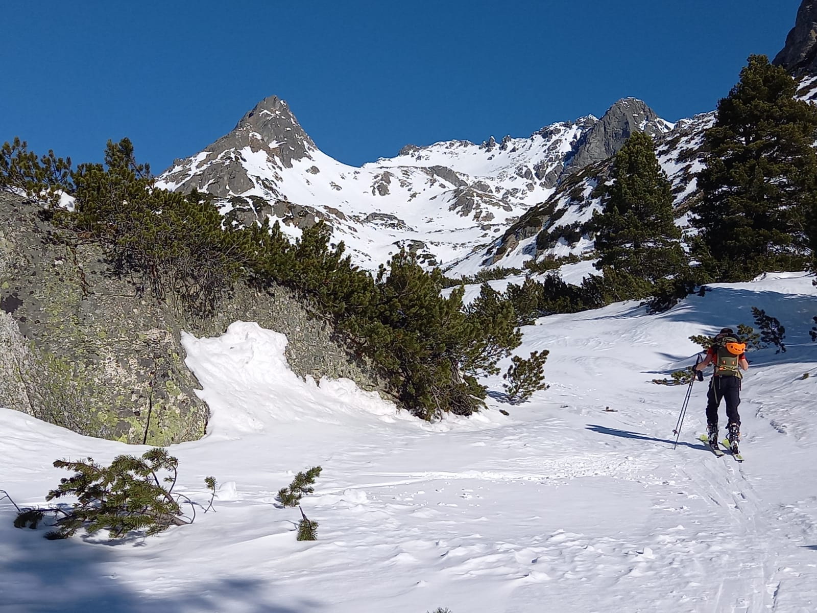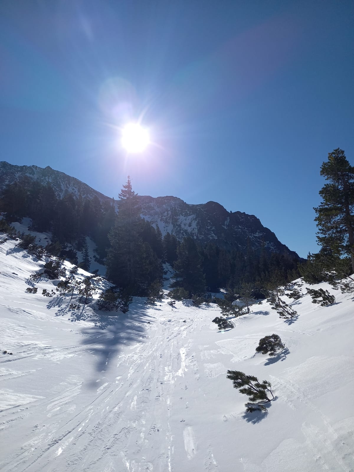 V lese špina a ľad. Tvrdo aj nad kosovkou. S použitím mačiek po miestami tvrdom až zľadovateľom snehu hore až do Rohatej štrbiny. Pri nástupe na Popradské pleso použitý chodník lesom od vodárne po ľavom brehu potoka, neskôr po zelenej značke na cestu. Návrat z Popradského plesa zľadovateľou cestou, viackrát potreba vypnúť lyže.