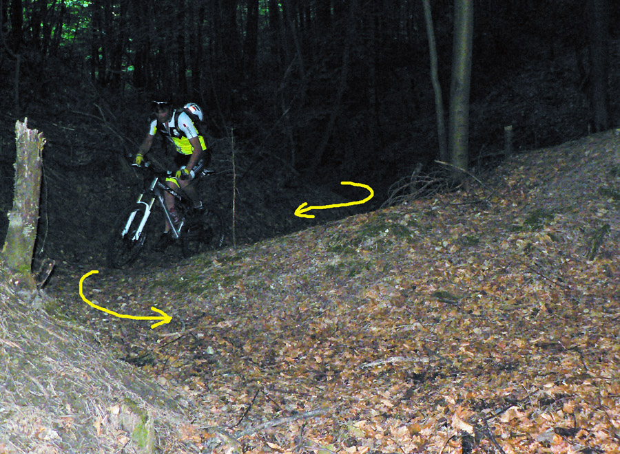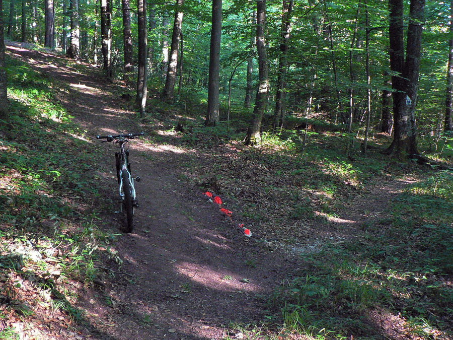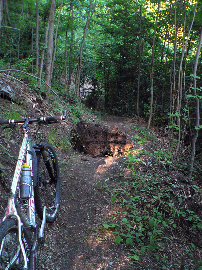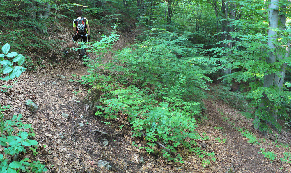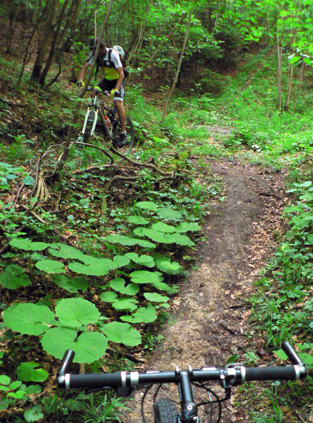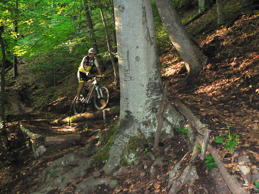 Jeho začiatok je trochu strmší, užší, po júnových búrkach už aj vodou načatý. Ako na feratách: trochu náročnejší, nech hneď na úvod odradí slabšie nátury - pre ich vlastné dobro :-) To ale len zatiaľ, aby na chodníku nebola veľká premávka, kým nie je dokončený. Po takomto úvode už ale nasleduje hravé hore-dolu-doprava-doľava. V smere jazdy samozrejme viac dole ako hore, doprava si treba dávať viac pozor ako doľava. Lebo svah pod chodníkom je niekedy dosť strmý a trčí z neho všeličo nepríjemné. Ako v lese. V smere jazdy preto, lebo všetky single sú vymyslené ako jednosmerné. Aby sa v protismere nestretli dvaja bajkeri – s pešiakom sa dá predsa len lepšie vyhnúť. Postupne všade pribudnú tabule, ukazujúce smer a vyzývajúce na ohľaduplnosť. Inak prvá polovica trailu je pohodovejšia, druhá trošíčku rýchlejšia a technickejšia, trčí tam napríklad viac koreňov: