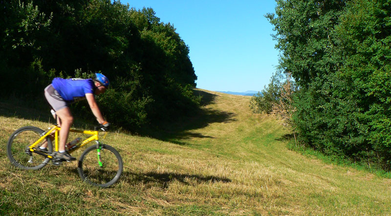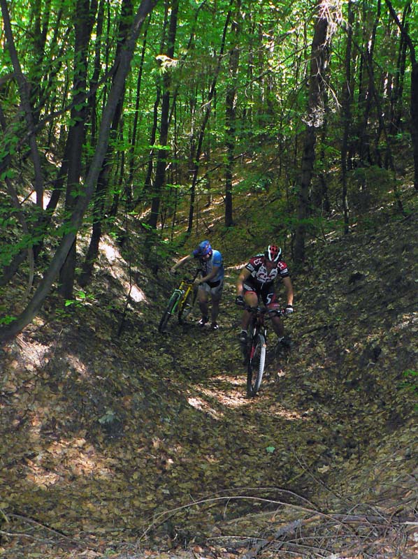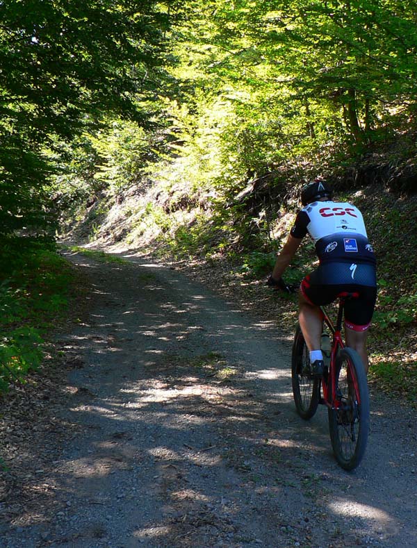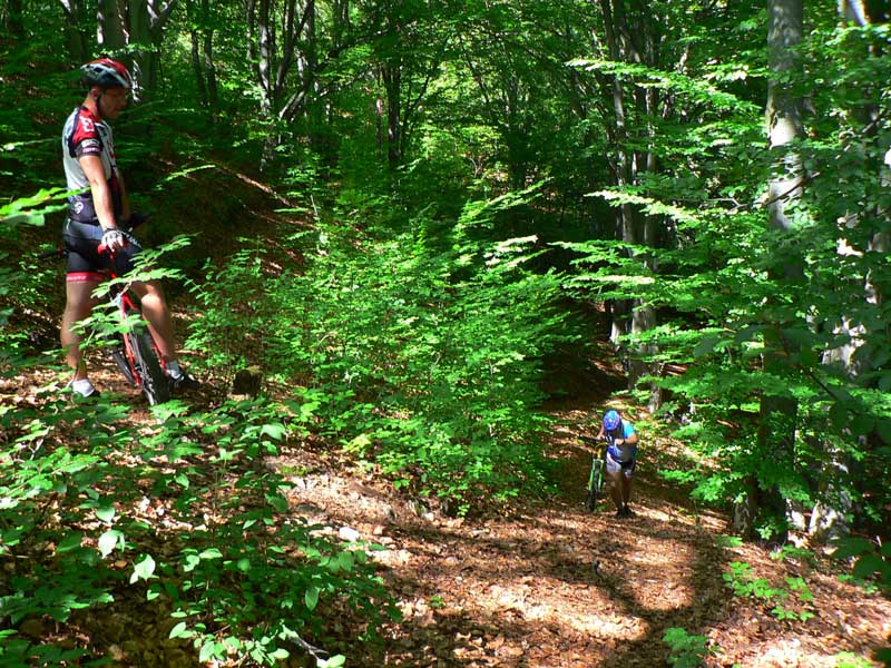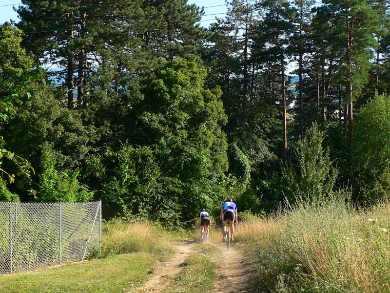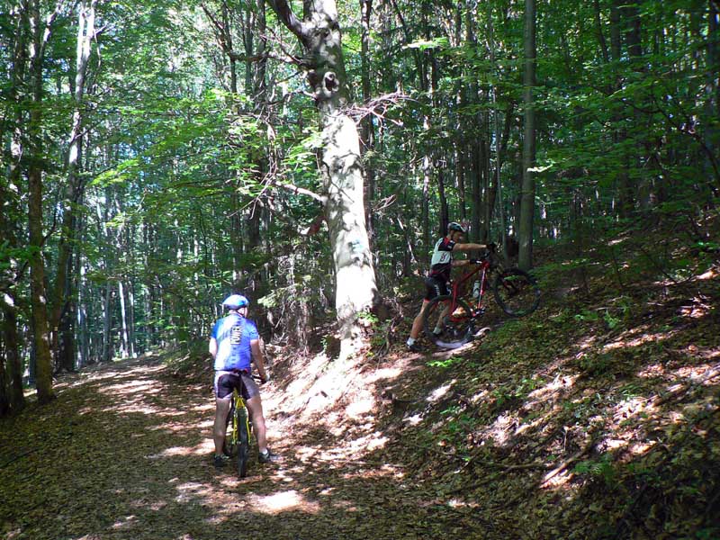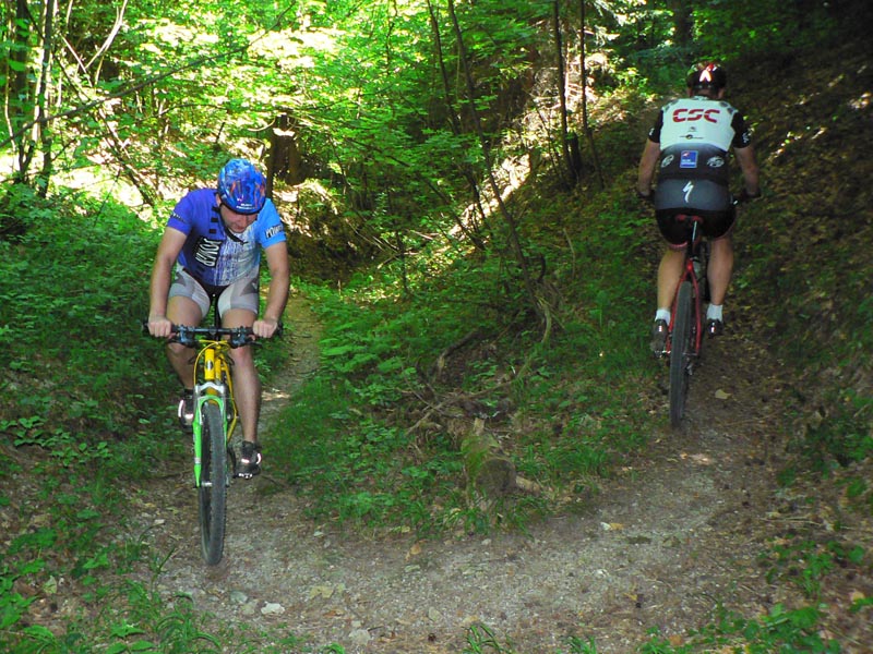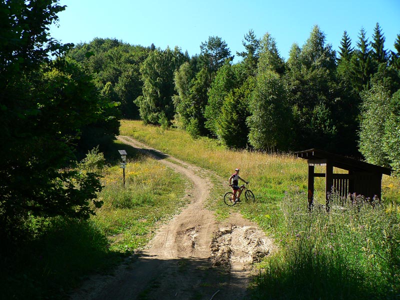 Takže vyrážame traja, v popoludňajšom hice z Podlavíc „od válova“, po prašnej ceste, ktorá vedie do Riečanského sedla. Zisťujem, že chalani o singlíku popod zvážnicu do sedla nevedia, takže pri rampe velím odbočiť vľavo a už sa šplháme čoraz strmším výmoľom. Trochu driny na jeho konci a potom už pár kilákov príjemného traverzu v tieni lesa. Len kolesá sem - tam odskakujú nežiaducim smerom na borovicových šuškách. Na konci pár strmších a úzkych „vracačiek“, na prejazd ktorých treba mať excelentnú techniku (nie náš prípad). Medzi nimi ale ďalšie stovky metrov príjemných chodníčkov a konečne sa vynárame na ceste do Riečanského sedla.