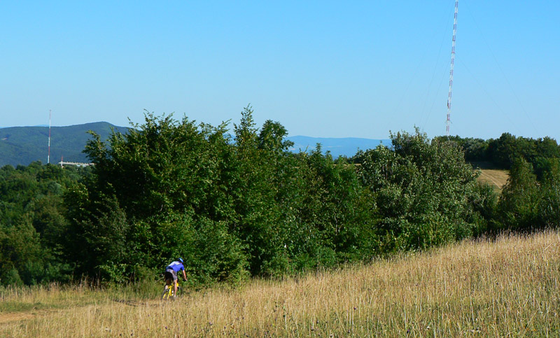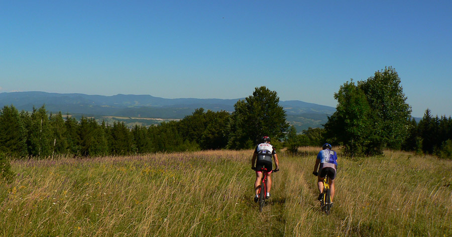 Na konci strmší, ale jazditeľný výšvih tmavým smrekovým lesom a sme na lúkach na Ravaskách. Míňame odbočku do Jakuba, zliezame „držkopádový“ úsek lesnej cesty - strmý až tak nie, ako eróziou doriadený a jemnou šotolinou pokrytý - ani preletieť, ani pribrzdiť. Za ním výhľadotvorné lúky na Laskomeri, poza vysielač. Ešte zjazdík krížom na juh po lúkach, po traktorovej stope a cez prieseky v krovinách do Laskomerskej doliny, aby sme sa dostali na začiatok posledného, najkratšieho a najjednoduchšieho chodníka - len asi 1,5km, prakticky po rovinke ponad asfaltku. Vynárame sa z neho pri smerovníku „Pod Machútovom“ po nejakých 2 hodinkách a čaká nás už len fukot dolinou po asfalte na Medený Hámor, na prečistenie dezénu. Keď sme to cestou dolu rozoberali, hádam by to bolo viac jazditeľné v opačnom smere, len by bolo treba vyliezť po asfaltke na Laskomer k vysielaču. Ale aj takto dobre :-)