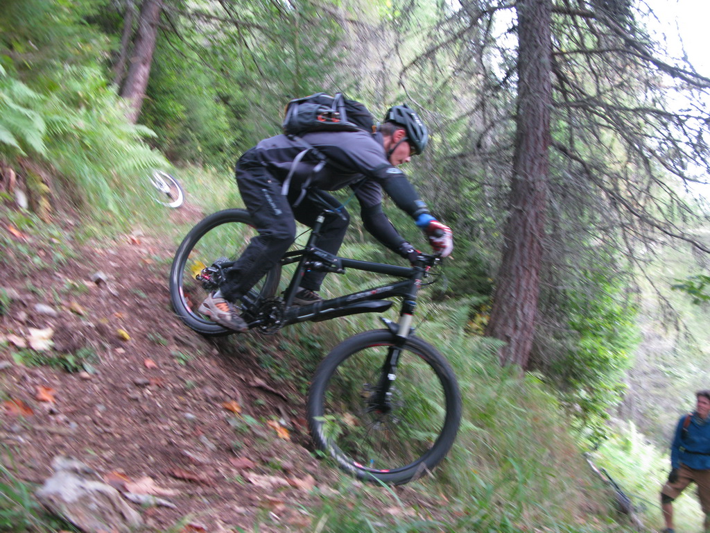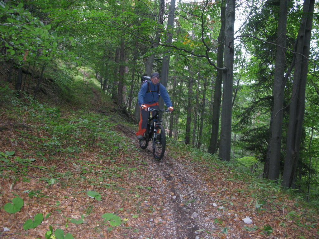 Zjazdujeme. Nádherný a divoký chodníček, sem tam zapadaný stromami. Všade plno pavučín. Na zemi hlboké lístie. Nad Vernárom sa napájame na najkrajšiu časť trailu. Tu domáci aktivisti spravili krásny zjazd s klopenkami a menšími skokmi, dá sa samozrejme prejsť aj bez skákania.