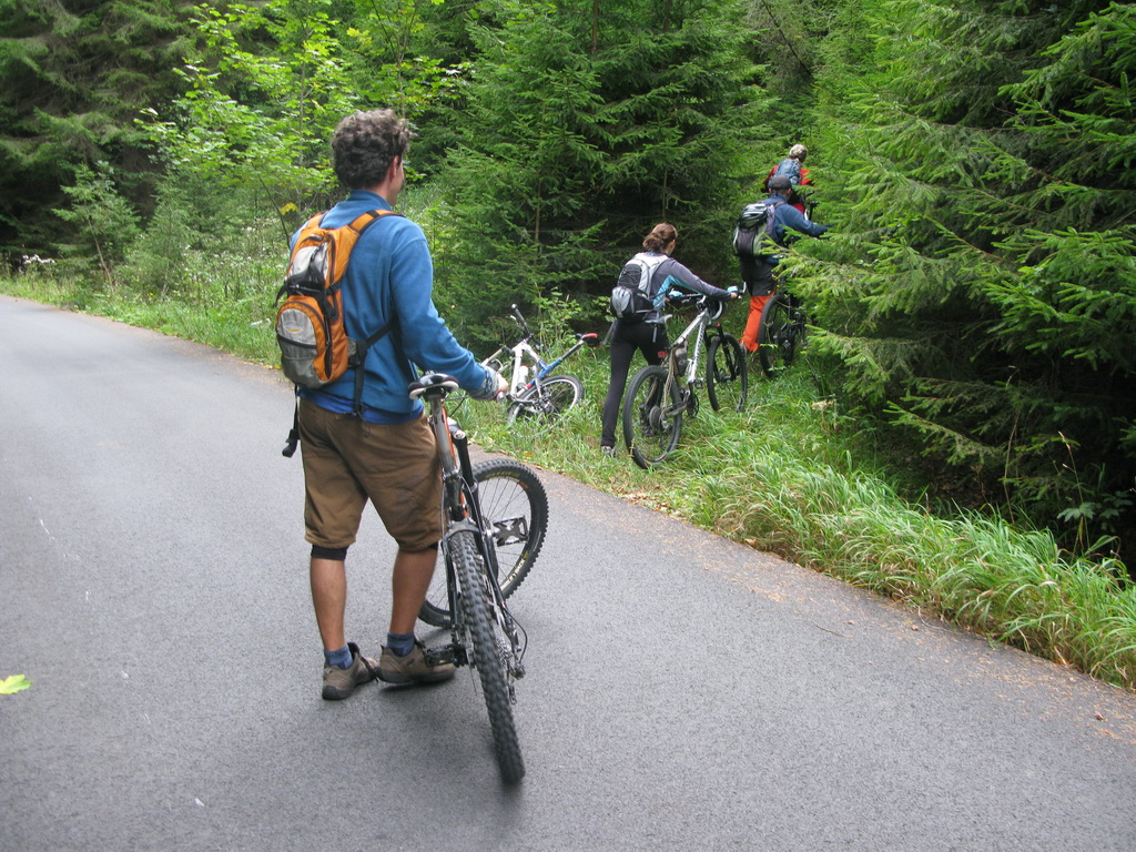 Dlhé stúpanie si krátime rozhovorom. Dozvedám sa ako kedysi obec Rychleby do ktorej ani poriadna cesta neviedla ožila po výstavbe špeciálych trailov. Dnes tam vraj príde 20 000 návštevníkov ročne. V obci sa uživia penzióny, reštaurácie, cyklistický servis, požičovňa, obchod... A to všetko vďaka jednému pahorku s cestičkami?!