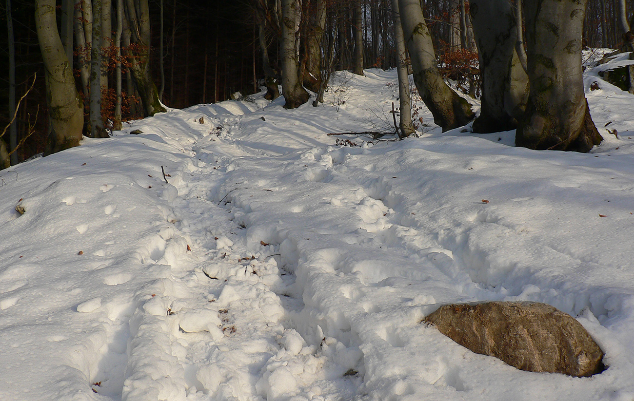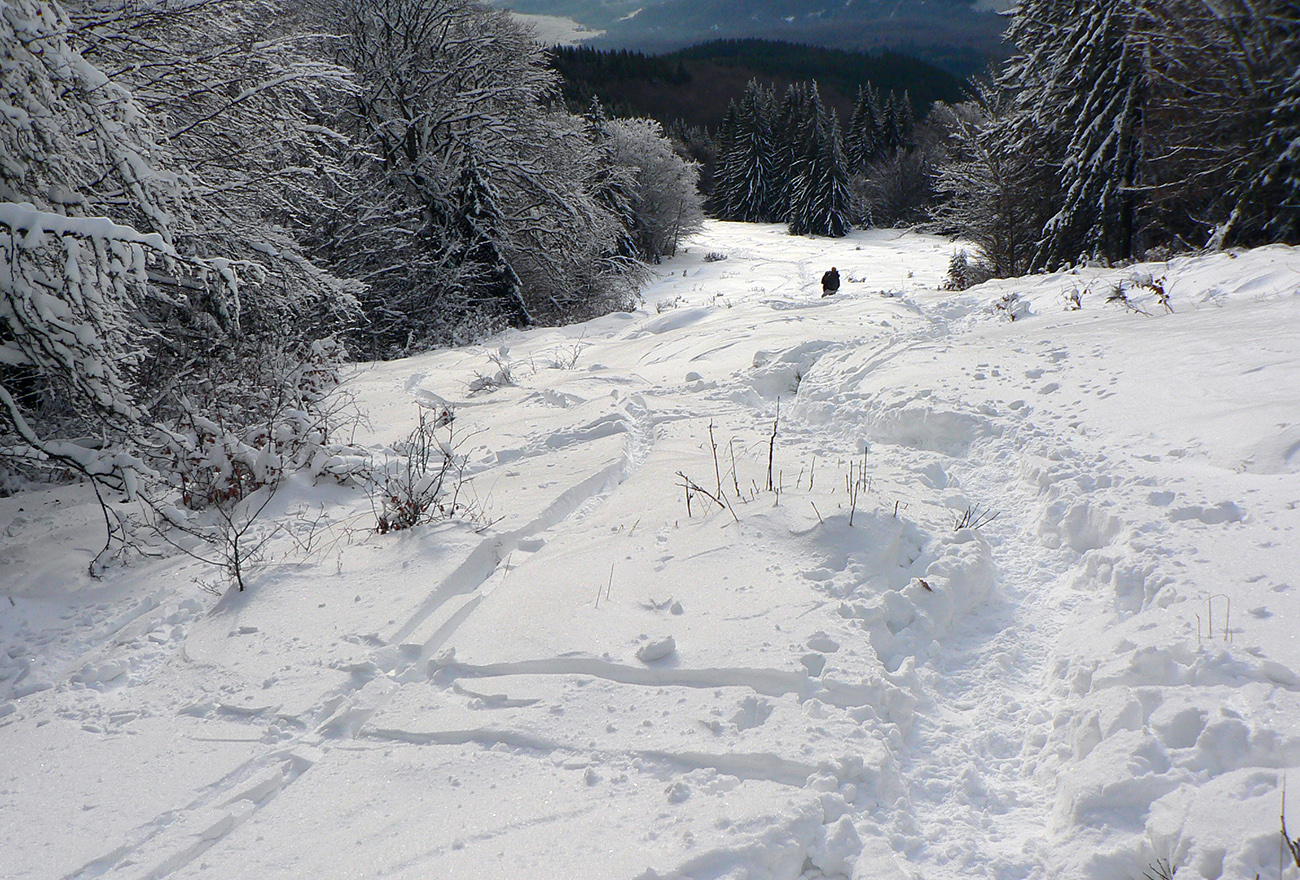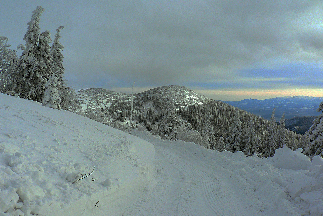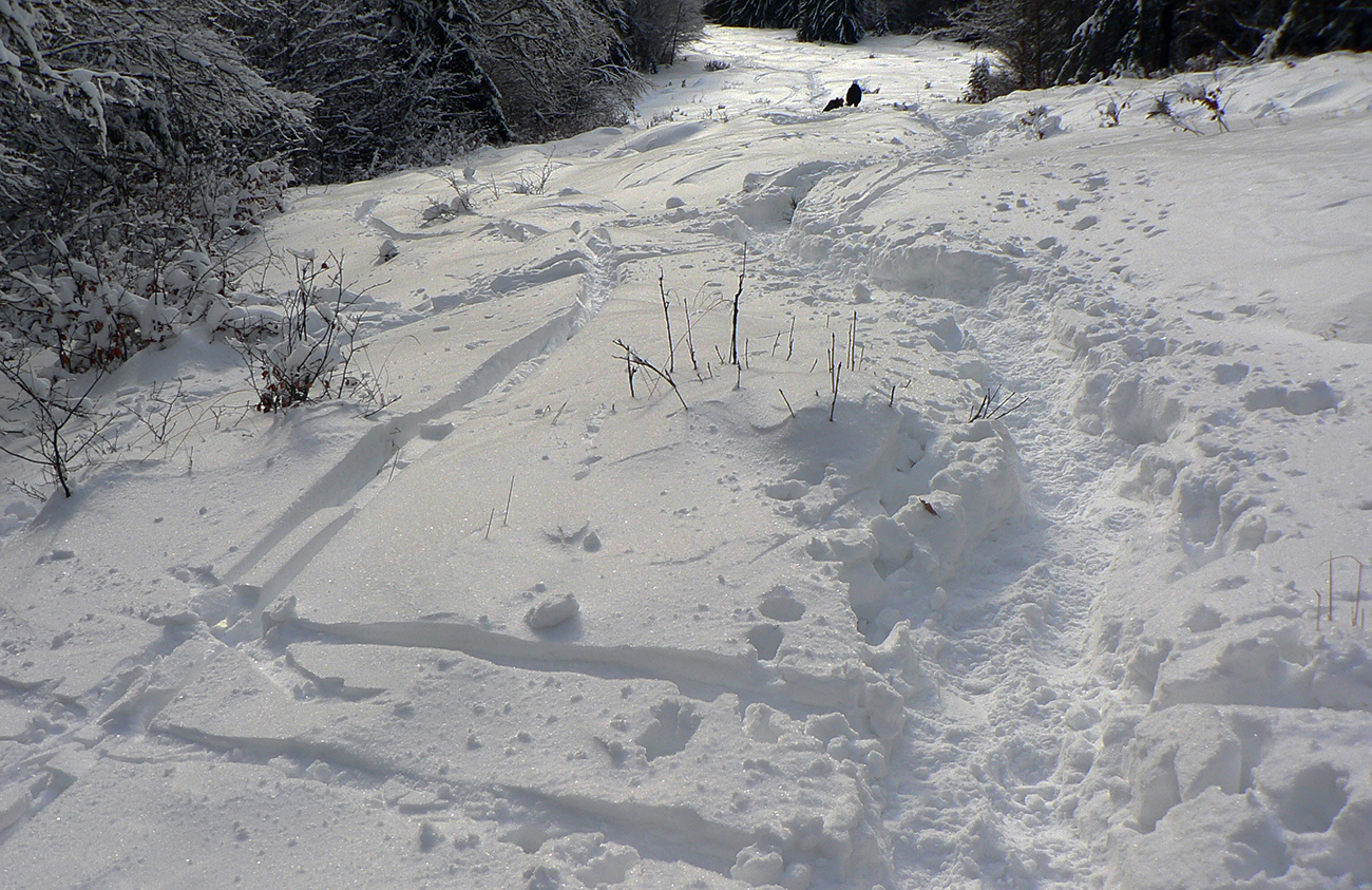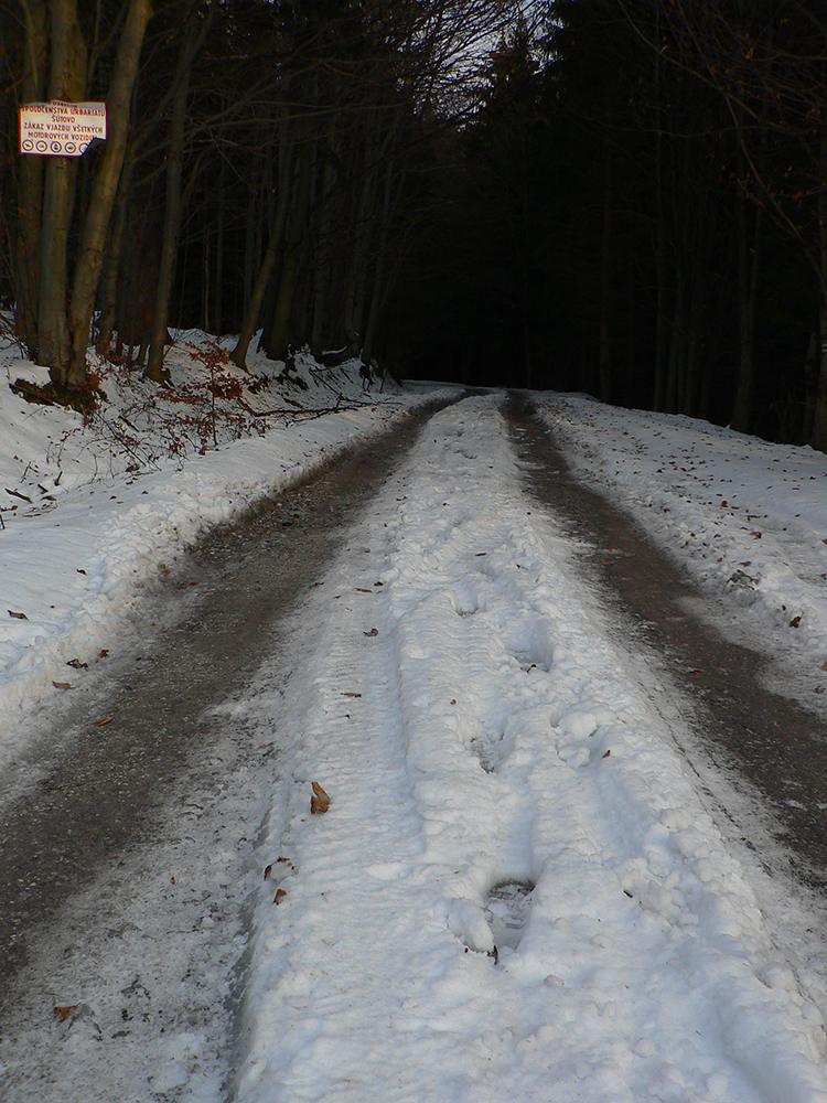 V lese nad Zajacovou je takých 15-20 cm a tiež ešte kôrka, ale dole lesom na lyžiach už by sa opatrne dalo bez prepadávania. Lyže kôrka podrží - jeden local hero už to dal! Nad drevoskladom v lese už je to na pohodu, ale len smerom hore. Lebo s rastom výšky pevnosť kôrky slabne a keďže podklad žiadny, oblúky smerom dole sú dosť problém. Lyžovačka dole Generálom len pre machrov a samovrahov – prepadačka do jafúr. Ale od chaty dole až pod Ploštiny je už cesta biela a ratrakom pekne prehrnutá, dá sa po nej.