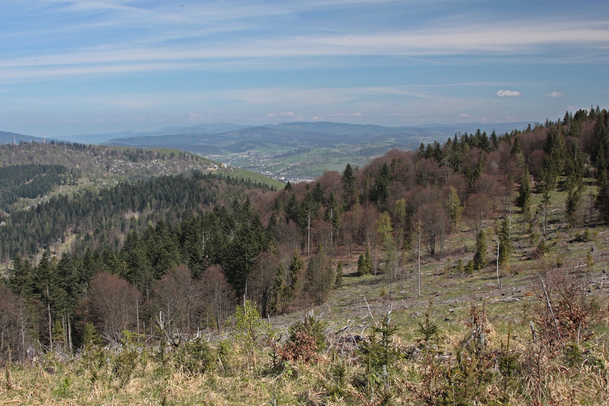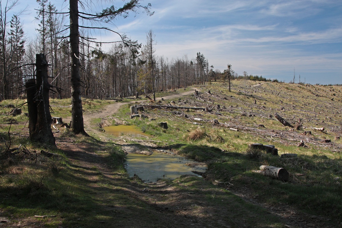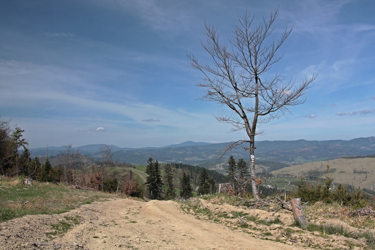 V stúpaní z osady k hrebeňu Javorníkov prechádzam aj cez rozsiahle rúbane. Vďaka nim sa mi otvára výhľad poza chrbát až na celý hrebeň Krivánskej Malej Fatry. Na okraji zvyškov lesa neďaleko križovatky lesných ciest však zazriem aj čosi iné. Vyzerá to trochu ako posed a trochu ako perníková chalúpka. Niečo medzi tým... Útulňa na stračích nôžkach mi vyčarí úsmev na tvári. Poskytuje len strohý účelový priestor pre prípad núdze alebo zlého počasia, no dizajnovo je proste rozprávková :-) Od útulne je to už, čo by kameňom dohodil na zelenú turistickú značku nad osadou Vojty. Stúpanie sa trochu zjemní a lesy sa pravidelne striedajú s peknými výhľadovými lúkami. Najkrajší pohľad je tentokrát smerom k Čadci a Svrčinovcu. Míňam bivakový prístrešok s prameňom vo Vojtovskom sedle a pripájam sa na červenú Javornícku hrebeňovku od Čadce. Na kóte Chotárny kopec (906 m.n.m.) dosahujem najvyšší bod dnešnej túry. Jeho vrchol je schovaný v lese, bez výhľadov. To sa však už po chvíli mení a husté lesy vystrieda mesačná krajina holorubov. Ak si odmyslím tú spúšť, môžem sa vďaka nim kochať ničím nerušenými pohľadmi až na Moravsko-sliezske Beskydy s dominantnou Lysou horou. Musím si však dávať pozor aj pod nohy. Rozjazdené zvážnice plné hlbokých mlák ma držia v strehu, ale zjavne tešia mnohých adrenalínu-chtivých štvorkolkárov. Tí tu niekde musia mať hniezdo...