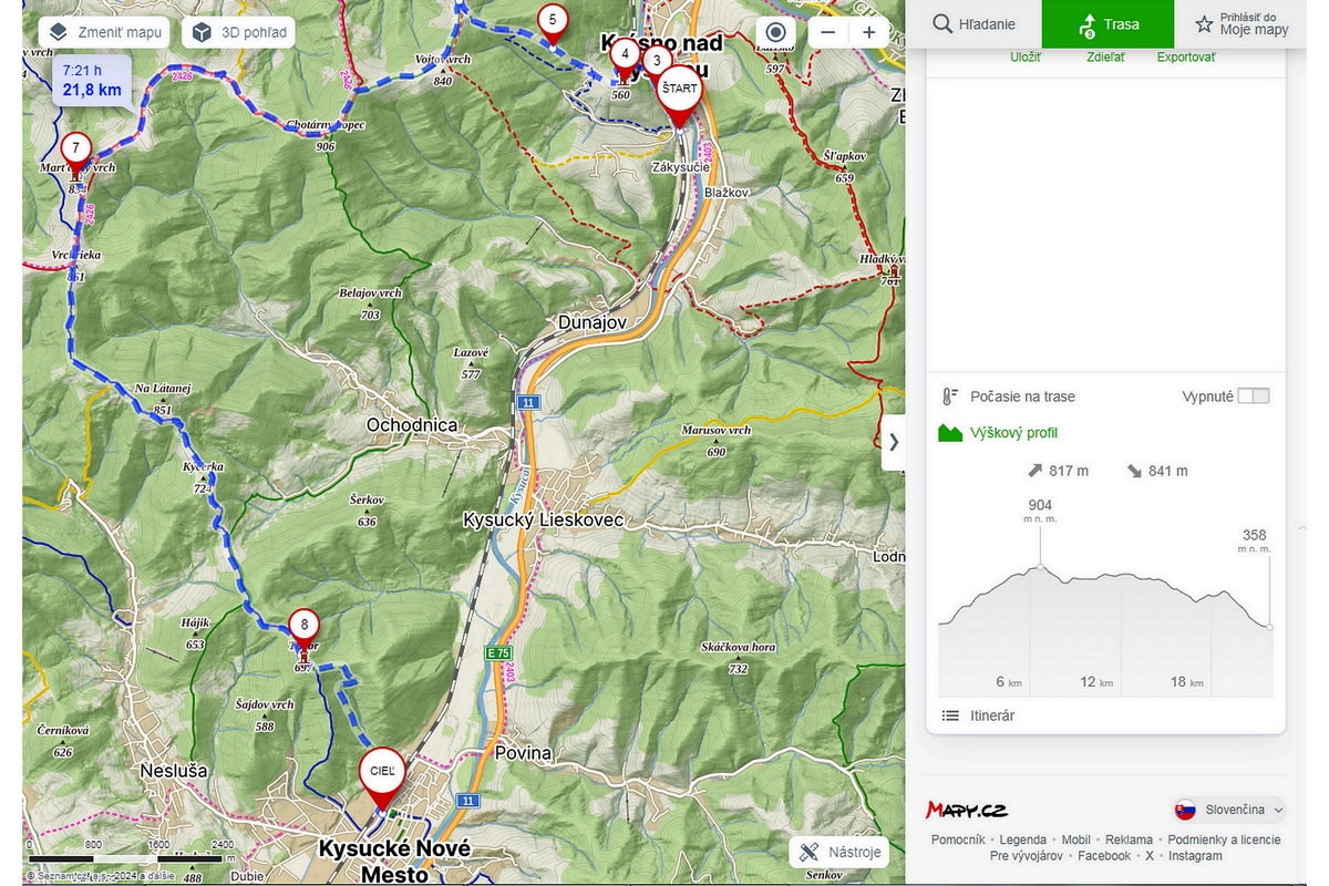 Posledné prudšie stúpanie na rozhľadňu Tábor dávam v zrýchlenom tempe, nech sa už konečne môžem pokochať výhľadom zo štvrtého poschodia drevenej stavby. Tá stojí na kóte 697 m.n.m. od roku 2015 a masív Stien s Ľadonhorou, Vreteň a Kysuckú bránu z nej máte ako na dlani. Blízkym výhľadom na pozadí konkuruje kompletka malofatranského hrebeňa od Rozsutcov až po Kľak. Viac o rozhľadni nájdete napr. TU . Odtiaľto to mám do cieľa už len dole kopcom. Vyberám sa po trase náučného chodníka cez miestnu kalváriu. Kalváriou som začala, kalváriou aj končím, nech to má symboliku. Spočiatku je klesanie celkom príjemné, no potom sa zlomí do prudkého padáka, prerušeného len jedným krátkym traverzom. Zato výhľady na Kysucké Nové Mesto sú tu parádne. Míňam jednotlivé zastavenia krížovej cesty, výborný prameň vody na okraji záhradkárskej osady a už ma pohltí ruch okresného mesta. Na stanici dávam po 22 kilometroch bodku za dnešným výletom.