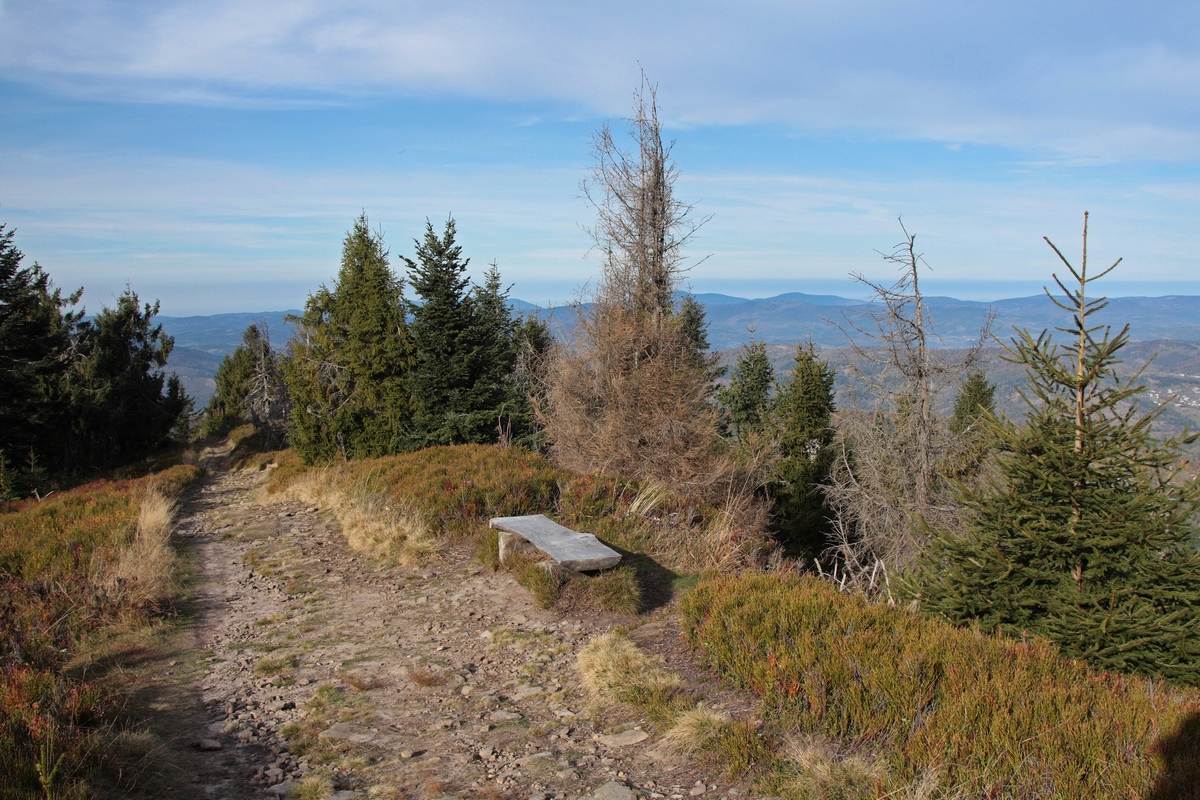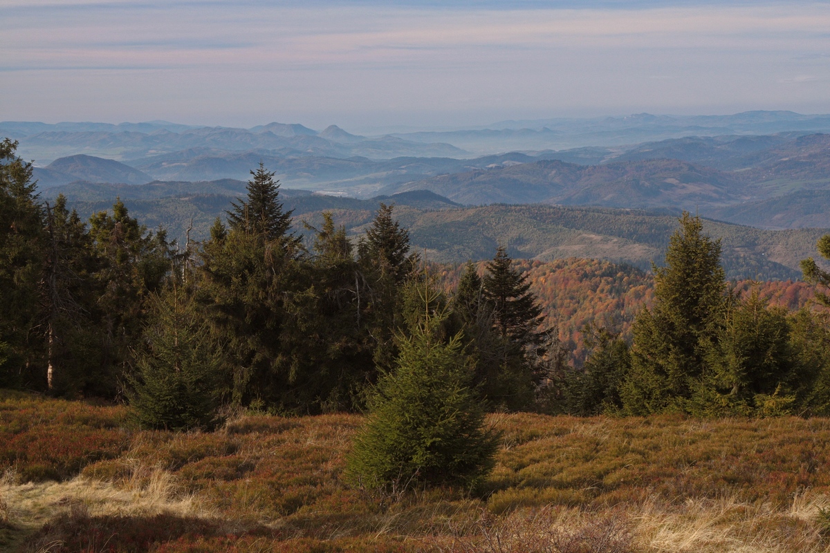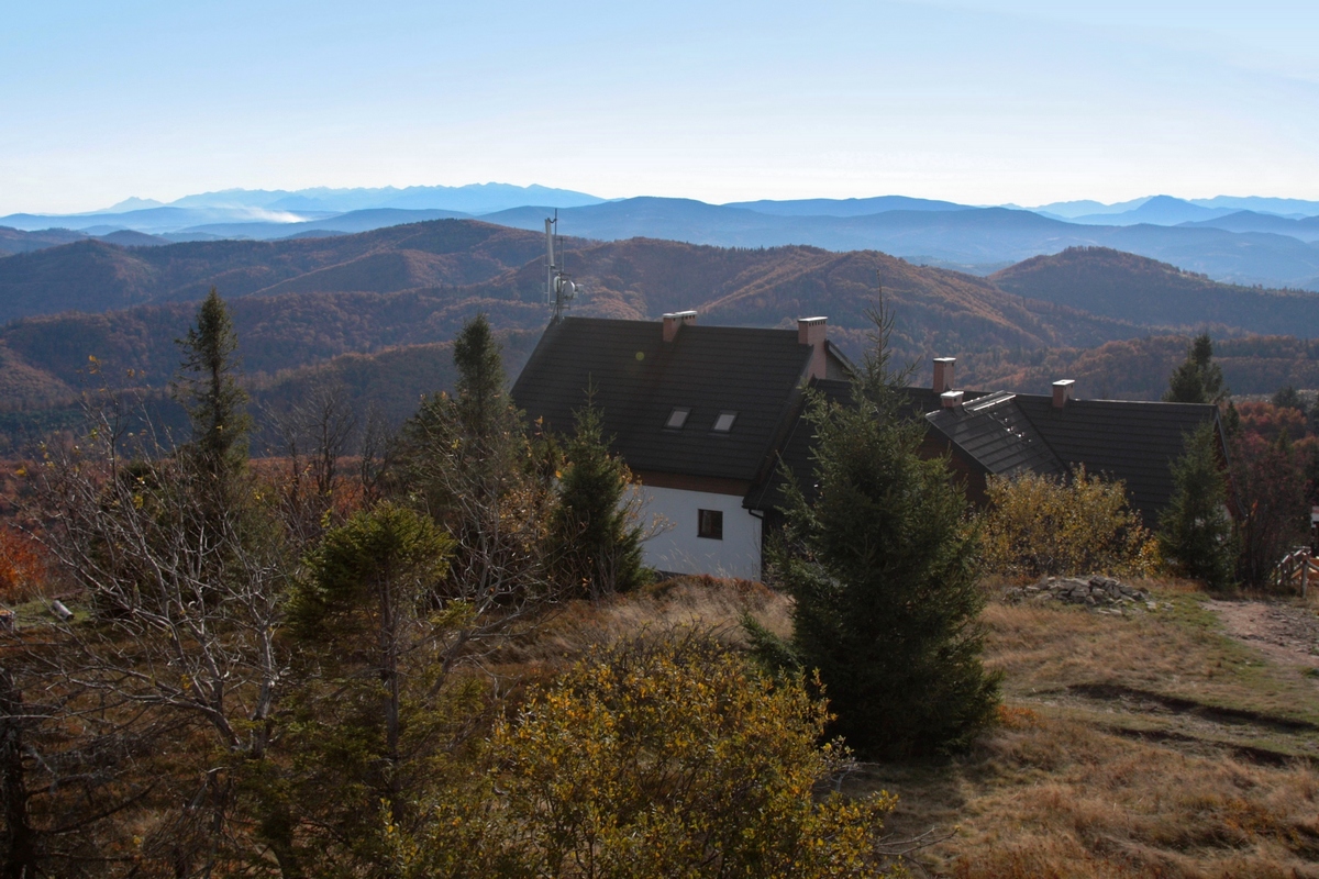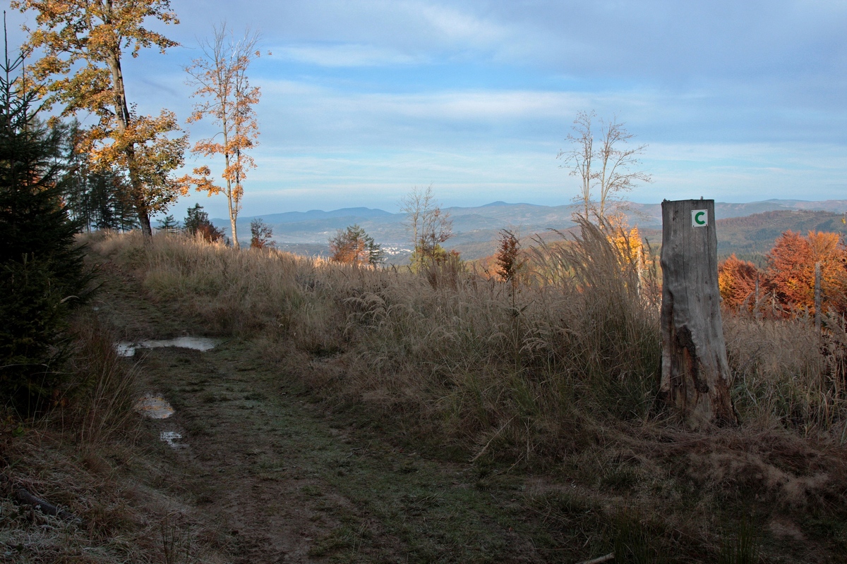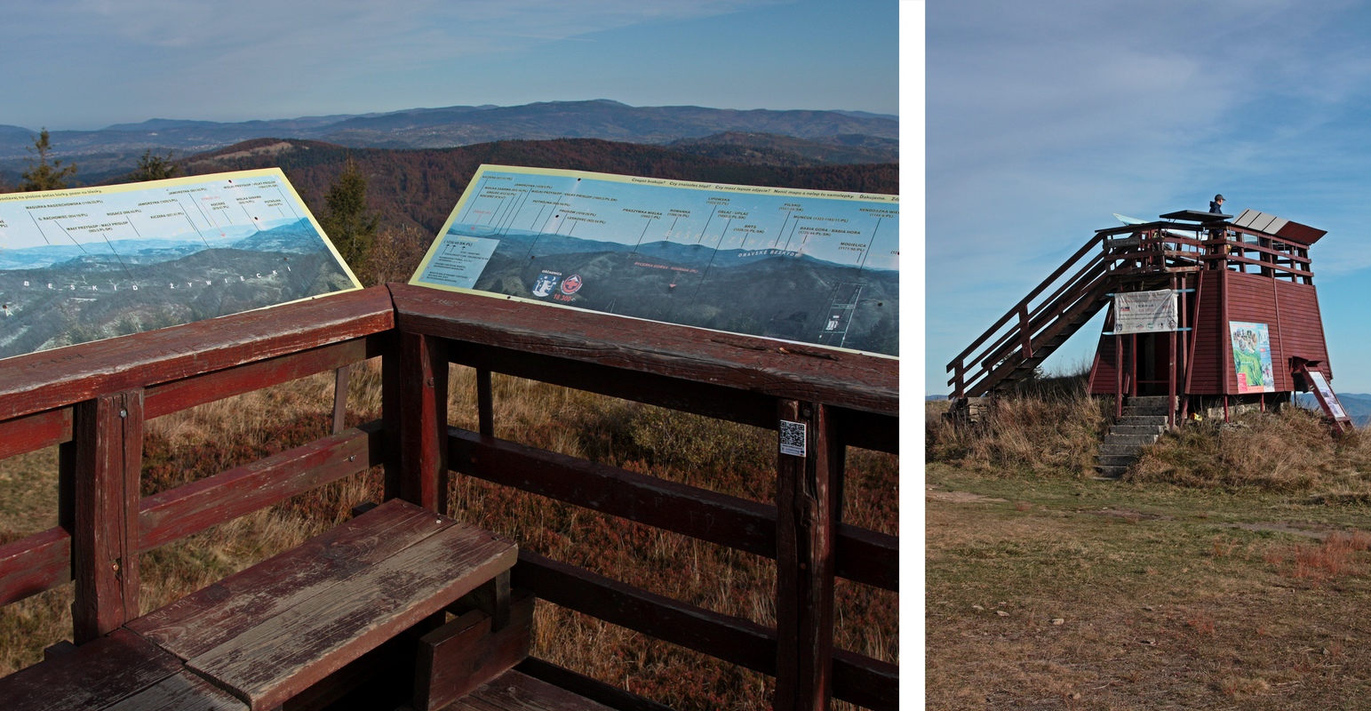 Popri drevenej kaplnke sv. Tadeáša a niekoľkých menších či väčších chatách stúpam hore. Míňam horné stanice vlekov Marguška aj Lalíky a konečne sa vnáram opäť do lesa. Ten hrá v tomto období všetkými farbami a ako naberám výškové metre, pribúda zelených ihličnanov aj červeného čučoriedia. Na kóte 1236 m. n. m. dosahujem najvyšší bod dnešnej túry, vrchol Veľkej Rače. Kopec je to sám osebe výhľadový, no ešte viac tomu napomáha bezmála 30-ročná vyhliadková plošina na vrchole. Nejde o rozhľadňu v pravom slova zmysle, má len štyri metre, no vďaka panoramatickým popisným fotografiám po jej obvode sa na ňu oplatí vystúpiť. Výhľad je dokonalo kruhový od Javorníkov cez Moravsko-Sliezske a Kysucké Beskydy, všetky Tatry aj Fatry, Chočské vrchy, až po Strážovské vrchy. Turistická chata pod vrcholom na poľskej stane hranice ponúka k pozorovaciemu zážitku doplnkové ubytovacie aj gastronomické zázemie.