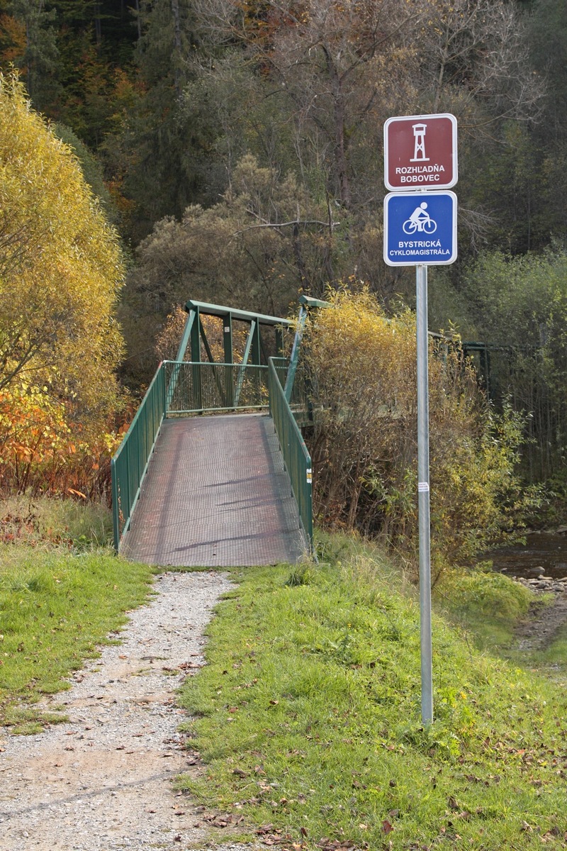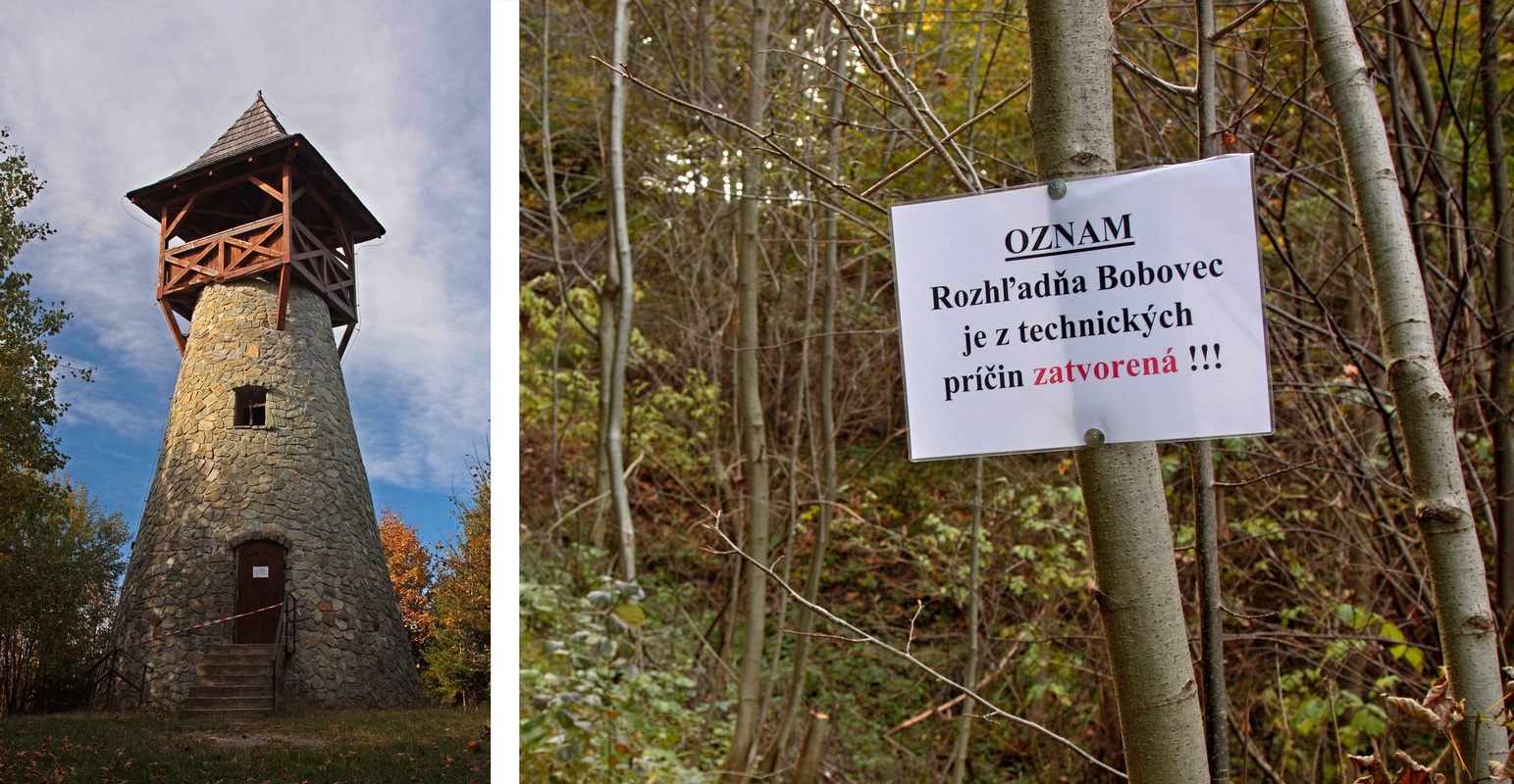 Žltou značkou opúšťam Starú Bystricu. Prechádzam lávkou na druhú stranu potoka a chvíľu kopírujem miestnu cyklotrasu. Potom sa chodník odpojí a smeruje strmo hore až k rozhľadni Bobovec. Už nejaký čas sa objavujú popri ceste oznamy o zatvorení rozhľadne z technických príčin. Napriek tomu sa rozhodujem pokračovať hore, veď snáď to nebude také zlé. Je to však ešte horšie. Jedno z najstarších Mikovčákových diel tohto typu je už po rokoch poznačené zubom času. Nepomohli ani anjeli, ktorí zdobia interiér rozhľadne. Drevo vyhliadkovej plošiny prehnilo a na údržbu či opravu zjavne nie sú peniaze. Škoda, výhľad z tejto krásnej, 16-metrovej stavby je určite nezabudnuteľný.