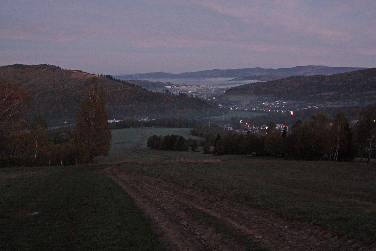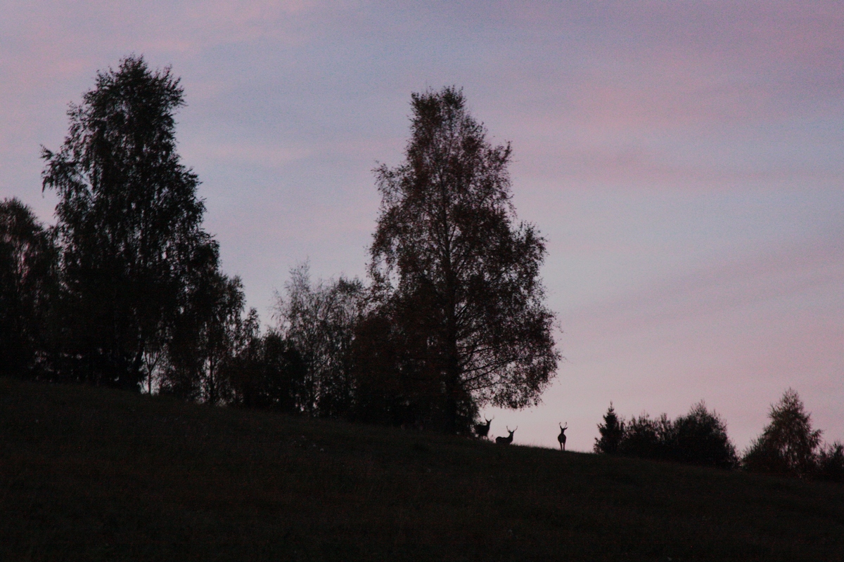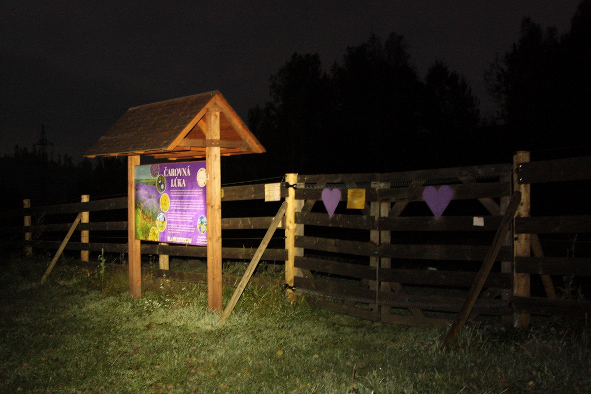Po modrej značke potom prechádzam okolo píly, popod hlavný kysucký cestný ťah a po chvíli bočím širokou cestou na rozsiahle lúky nad obcou. Hneď skraja natrafím na veľký oplotený areál Čarovnej lúky (viac TU ). Ide o projekt tímu ľudí z miestneho Garden centra, ktorí sa rozhodli na rozlohe takmer 8000 m2 vytvoriť farebný raj na zemi, voľne prístupný verejnosti. Počas roka tu nájdete bohato zakvitnuté záhony trvaliek aj letničiek všetkých možných farieb a vôní. V tomto období je už lúka zazimovaná a len zosušené súkvetia hortenzií na mňa mávajú z tmy. A tak kráčam ďalej pasienkami, sprevádzaná odleskom párov očí osvetlených čelovkou. Náznaky svitania nad východným obzorom demaskujú na horizonte čriedu jeleňov.