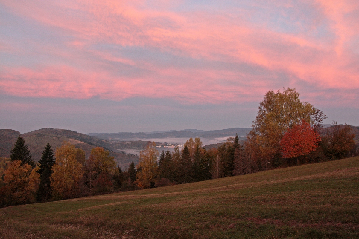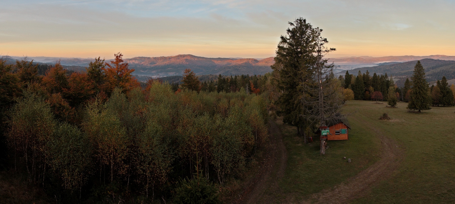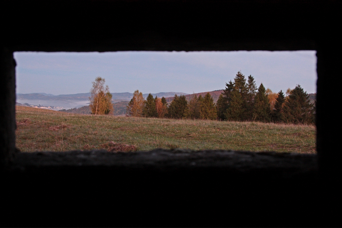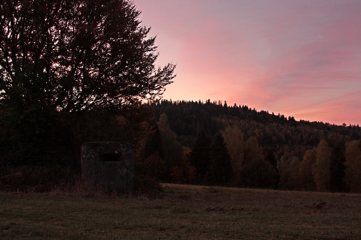 Ako pomaly stúpam popri salaši, dobieha ma ružové ráno. Okolo chodníka objavujem niekoľko malých betónových stavieb. Ide o pozostatky guľometných hniezd z 2. svetovej vojny typu Kochbunker (viac TU ). Niektoré sú zarastené a niektoré majú fakt luxusný výhľad na Čadcu a okolie. Pod Kalinovým vrchom sa pristavujem pri prvej dnešnej rozhľadni Surovina. Tá svojou architektúrou jasne zapadá do radu typických Mikovčákových rozhľadní - s kamenným podstavcom a drevenou nadstavbou. Od roku 2021 poskytuje výhľady do Kysuckej aj Oščadnickej doliny a na začiatok Javorníckeho hrebeňa. V jej blízkosti stojí aj veľký drevený prístrešok s posedením a ohniskom, tak chvíľu posedím.