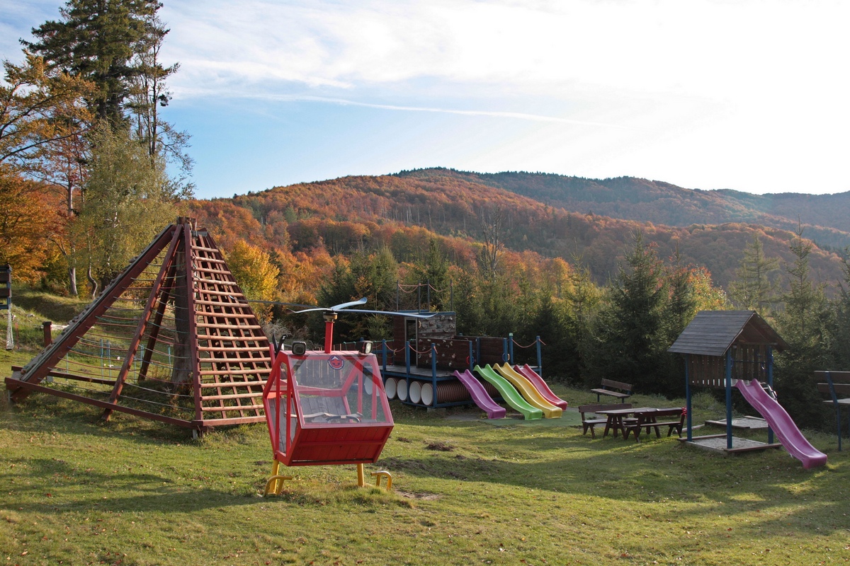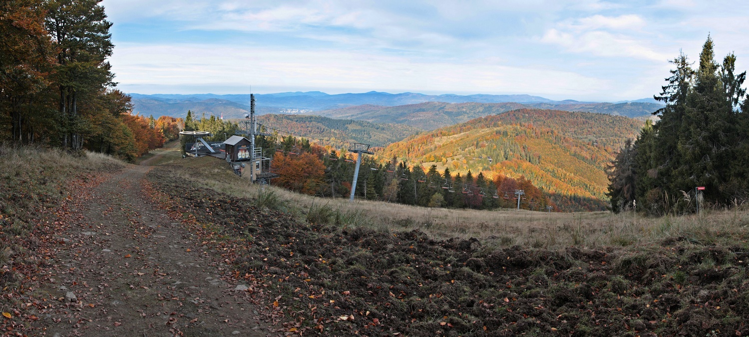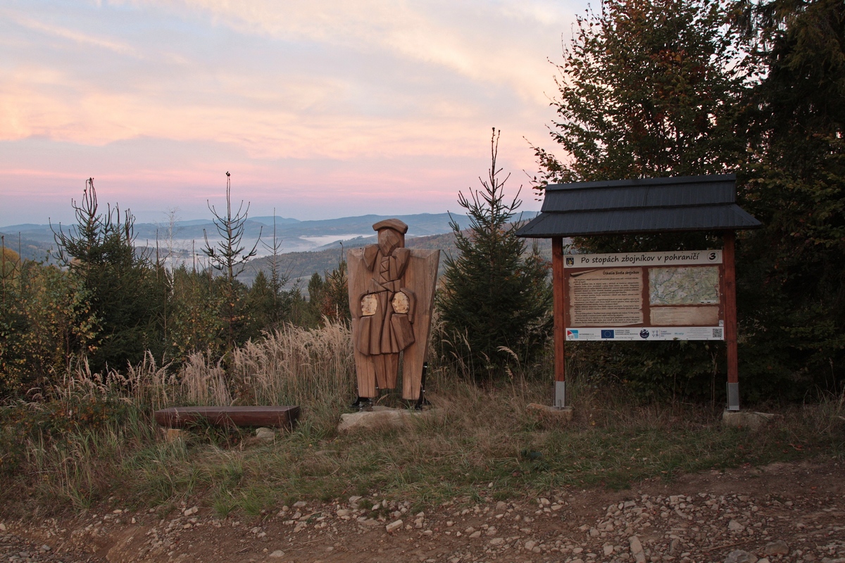Ďalej už napredujem prevažne lesom. Cestu mi spríjemňujú občasné výhľady a nadrozmerné drevené sochy zbojníkov. Tie sú súčasťou náučného chodníka Po stopách zbojníkov v pohraničí (viac TU ), ktorý prezentuje zbojnícku históriu na obidvoch stranách SK-PL hranice. Náučný chodník ma sprevádza až do lyžiarskeho strediska Snowparadise Veľká Rača. Tu pri hornej stanici rovnomennej lanovky nachádzam druhú dnešnú rozhľadňu Dedovka. Ide opäť o Mikovčákov počin z roku 2019 s výhľadom k česko-poľsko-slovenskému pomedziu na jednej stane a k hrebeňu Malej Fatry na druhej strane. Škoda, že táto 16-metrová stavba zaniká v architektonickej kolotočarine lyžiarskeho strediska.